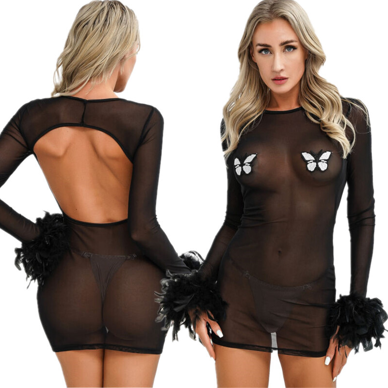 Front with see-through lace design, open butt and minimal coverage.