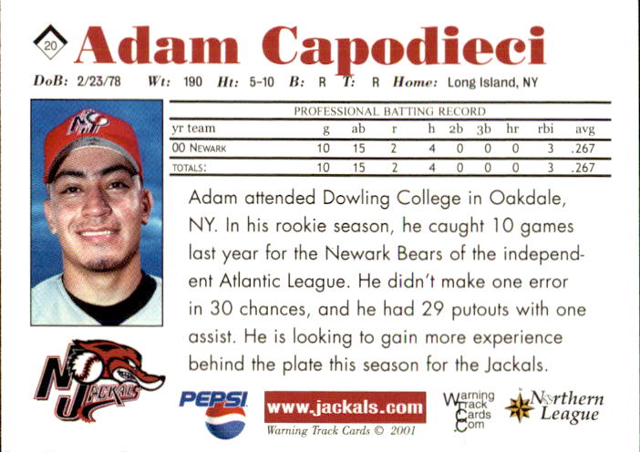 2001 New Jersey Jackals Warning Track #20 Adam Capodieci Long Island New York NY