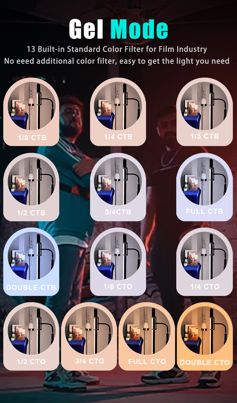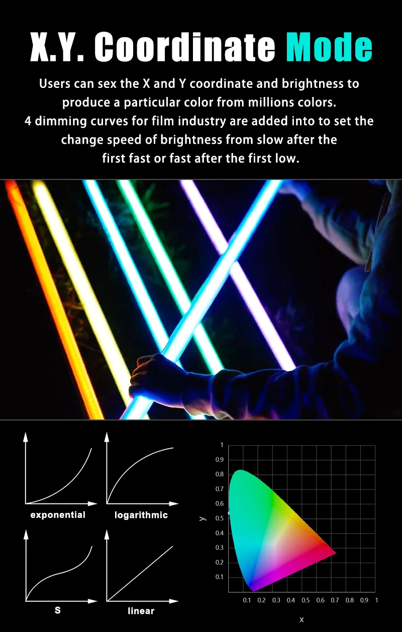 【X.Y color coordinate mode】You can adjust the light effect accurately through XY color coordinate and brightness,At the same time, four dimming curves commonly used in the film industry are added, so that the change speed of light and dark can be set according to your needs during the light sensitive adjustment process.