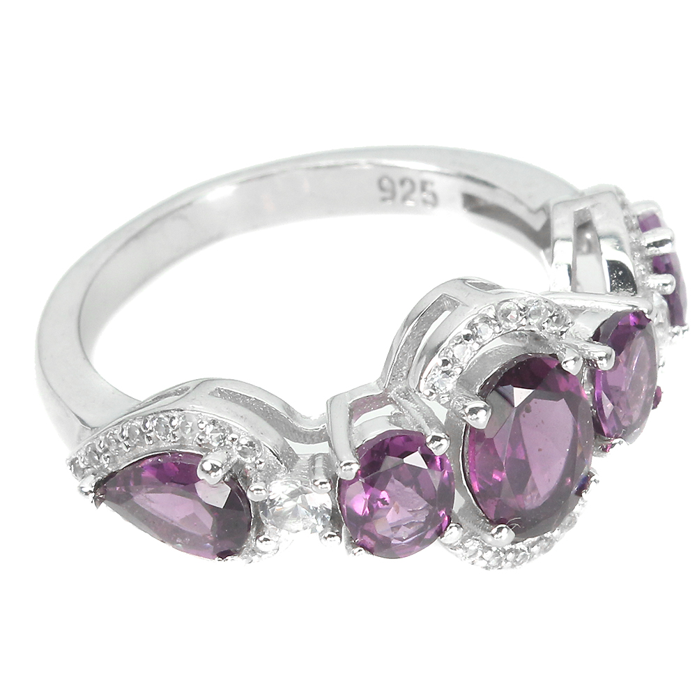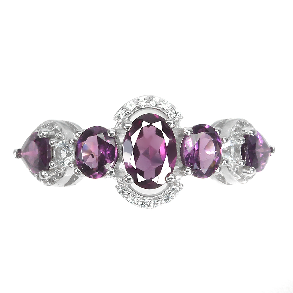 Unheated Oval Rhodolite Garnet 7x5mm White Topaz 925 Sterling Silver Ring 7.5