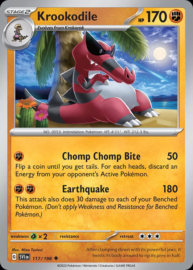 | | Name: | Krookodile | | Set: | Scarlet & Violet | | Number: | 117 | | Condition: | Near Mint or better | | Language: | English | | Variation: | Non-Holo | |