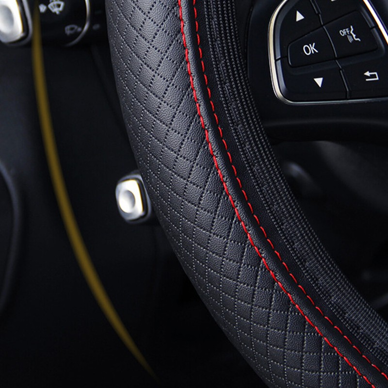 15" PU Car Steering Wheel Leather Cover Good Grip Red Black Stitch Leather Trim