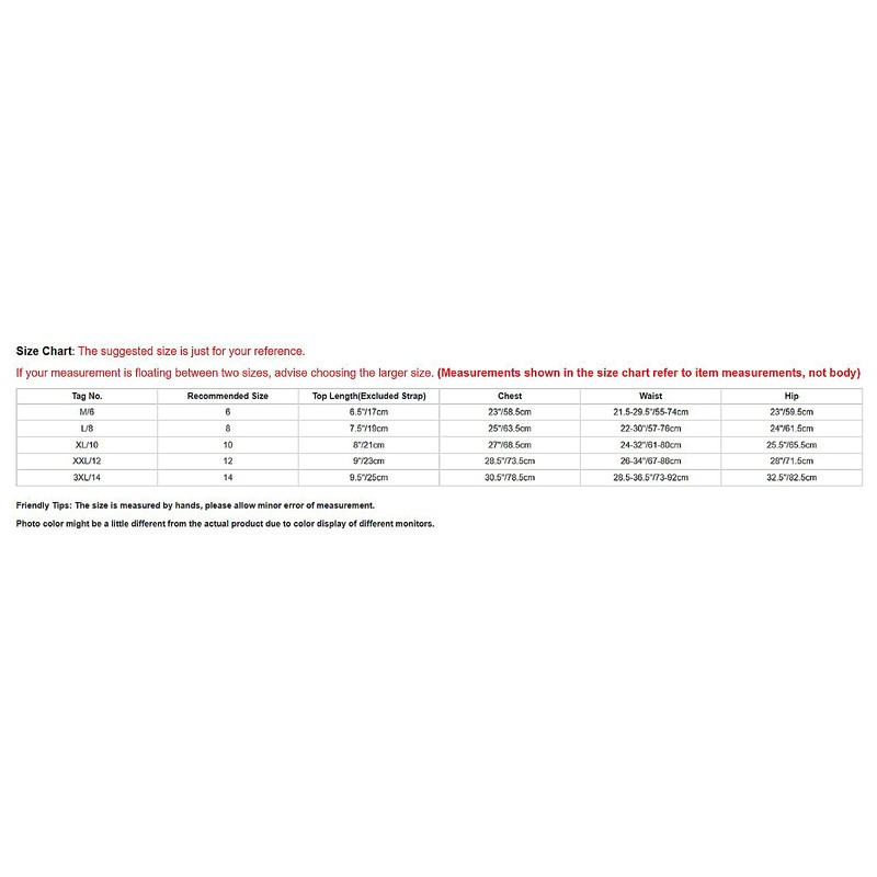 | Tag No. | Recommended Size | Top Length(Excluded Strap) | Chest | Waist | Hip |