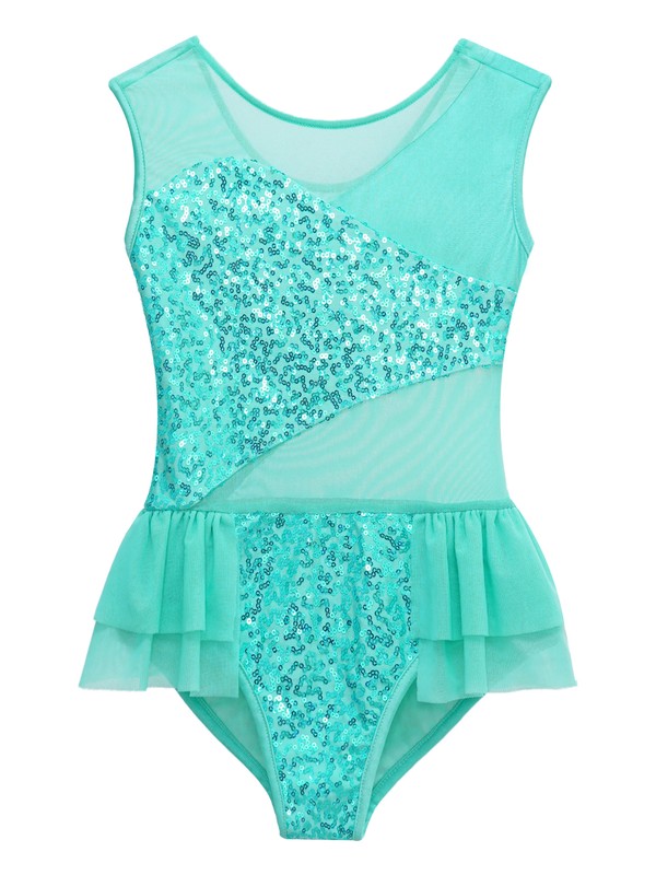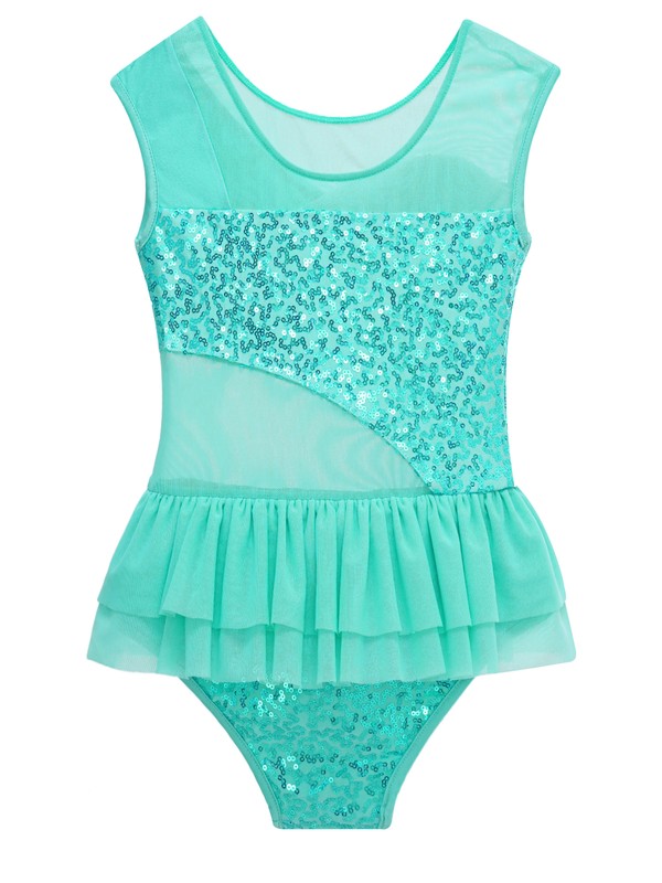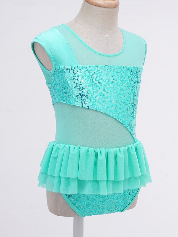 The leotards features with sleeveless and round neckline, shiny sequins decorated, fashion patchwork style.