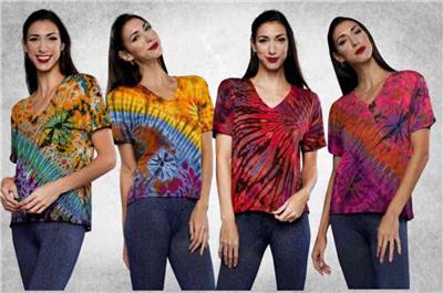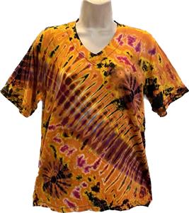 Artsy clothing for creative people who aren't afraid to show a little color! 100% Rayon Mudmee tie dye stretch tee shirt. These tee shirts are made in Thailand using tradional mudmee methods and dyes. There still might be the smell of the dyes on the fabric but this goes away with airing out and or washing. The fabric is pretty stretchy to accomodate more sizes. So groovy. The model is just to show what the item might look like on, but the item hanging on the mannequin in the separate picture is the pattern you will receive. Looks especially nice with jeans. Check the measurements below.