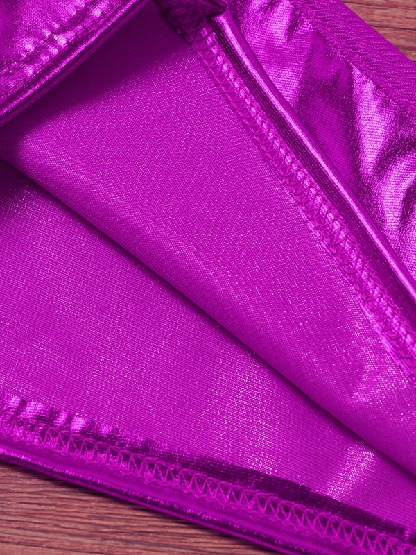 Single shoulder crop top with glossy appearance, pull on closure.