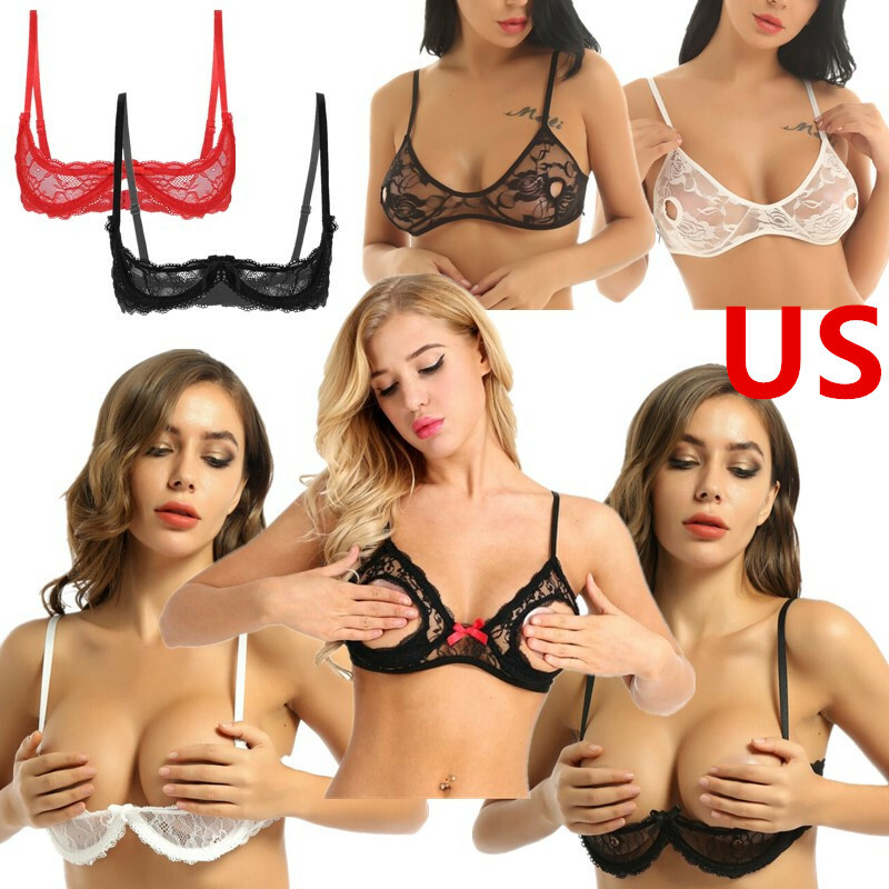 Womens 1/4 Cups Underwire Bra Halter Neck O Ring Sheer Lace Push Up Brassiere Underwear.