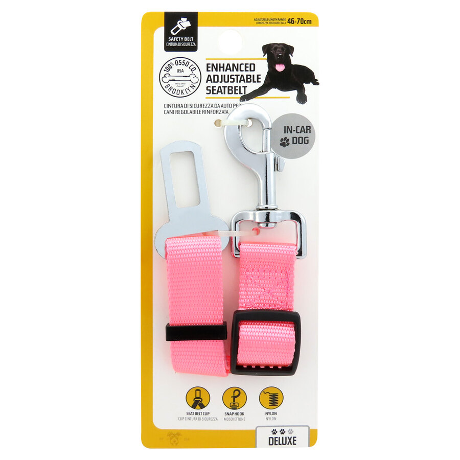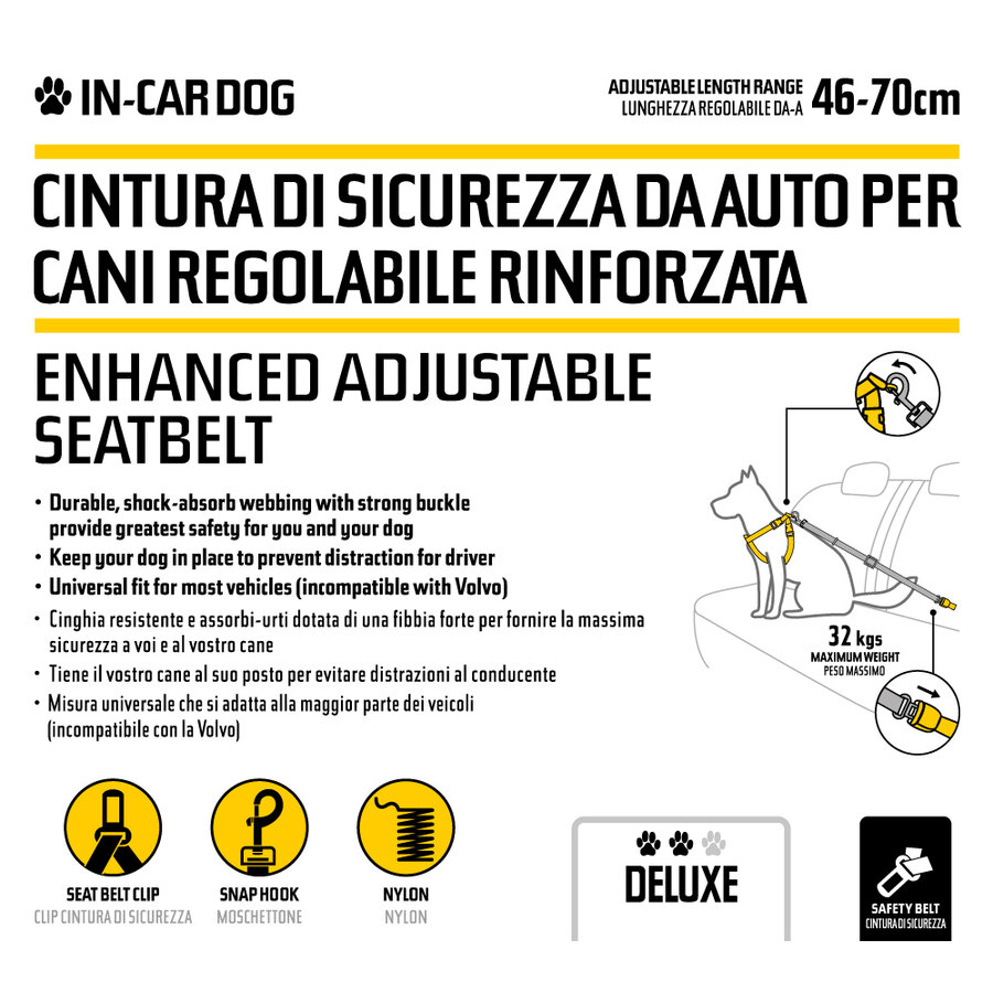 Cintura di sicurezza da auto per cani regolabile, rinforzata. Cinghia resistente e assorbi urti dotata di una fibbia forte per fornire la massima sicurezza. Misura universale che si adatta alla maggior parte dei veicoli (incompatibile con la Volvo). In poliestere. Peso massimo 32kg. Lunghezza regolabile da 46 a 70cm.