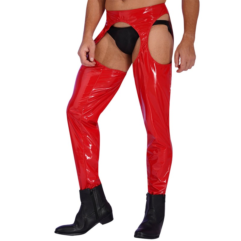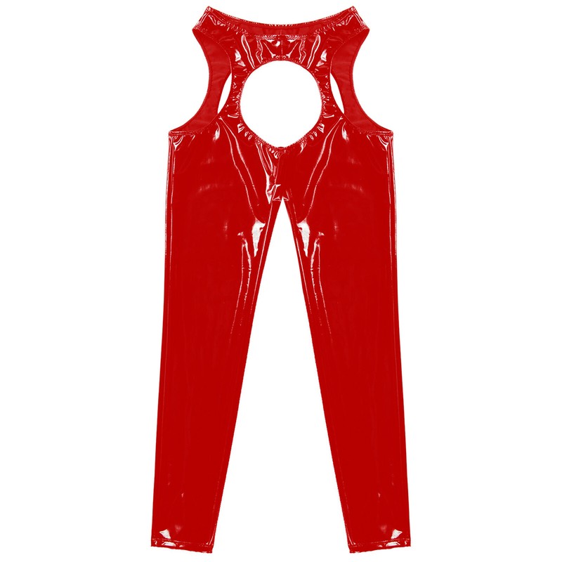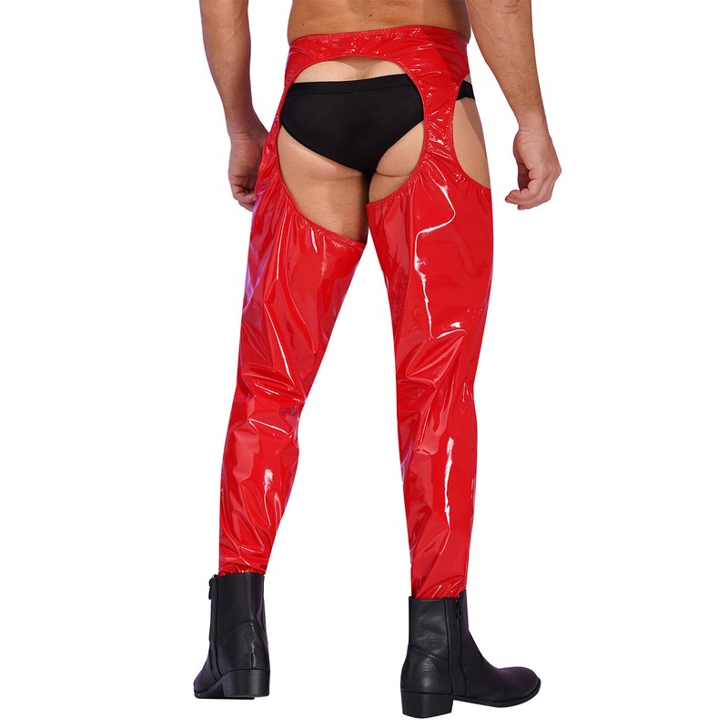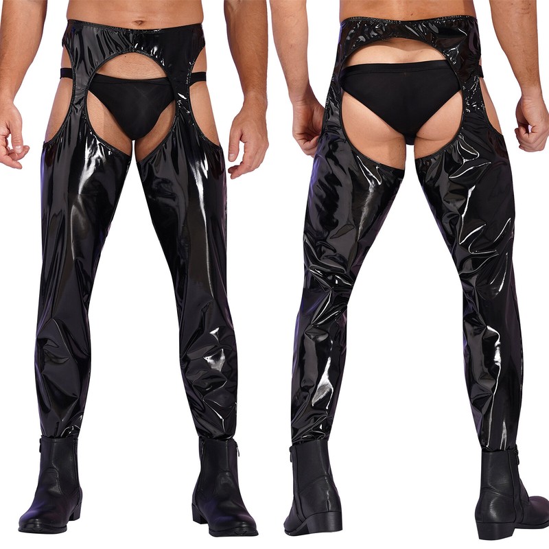 Wet look high waist cutout leggings crotchless open butt patent leather skinny pants for men.