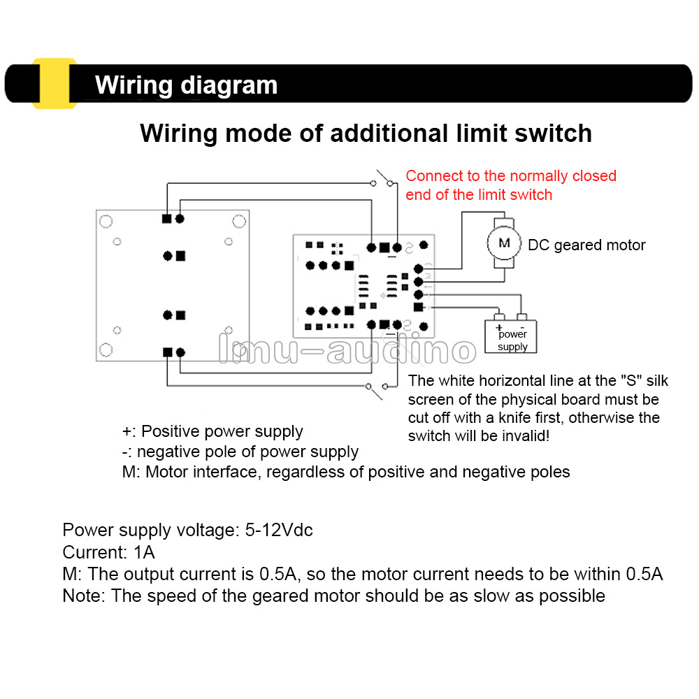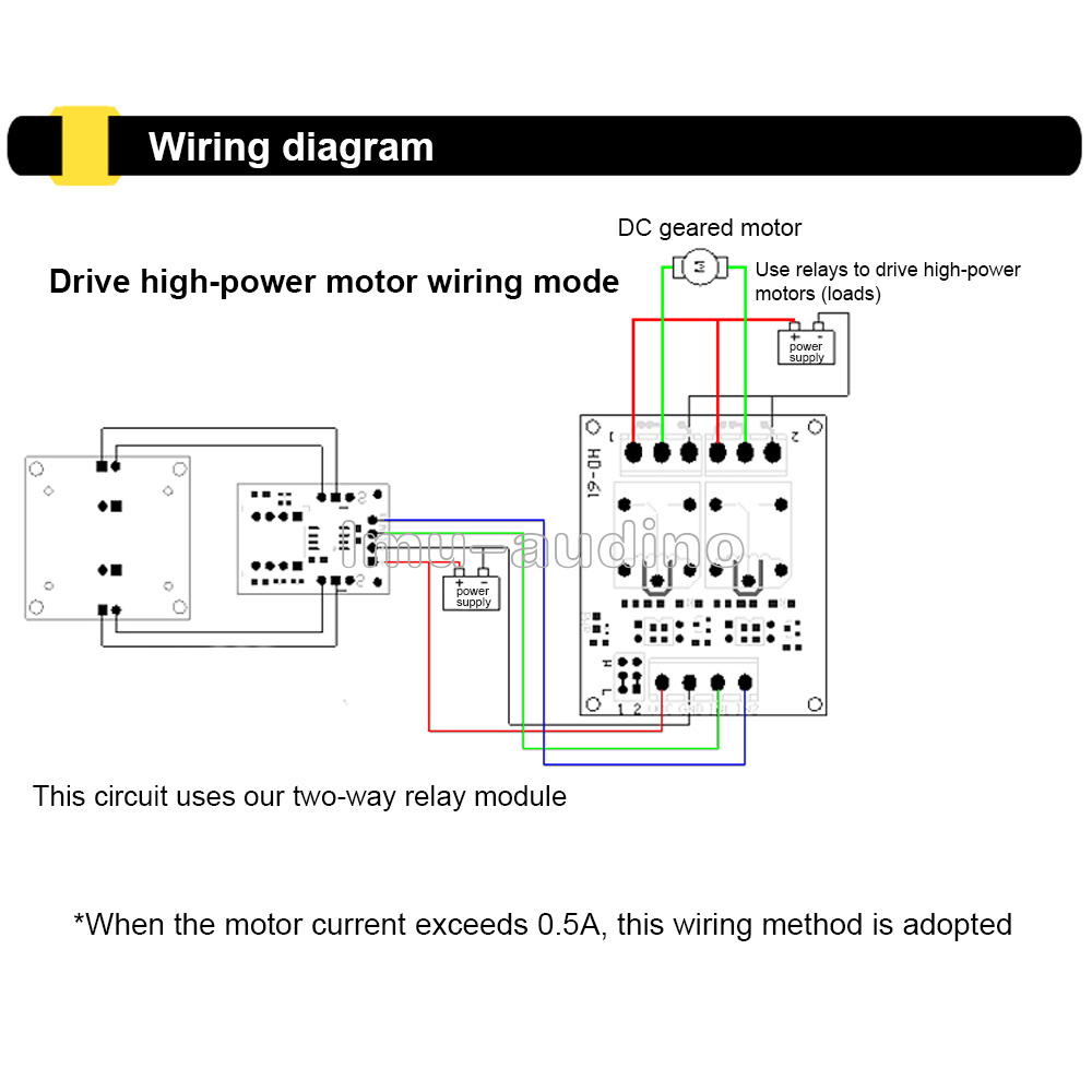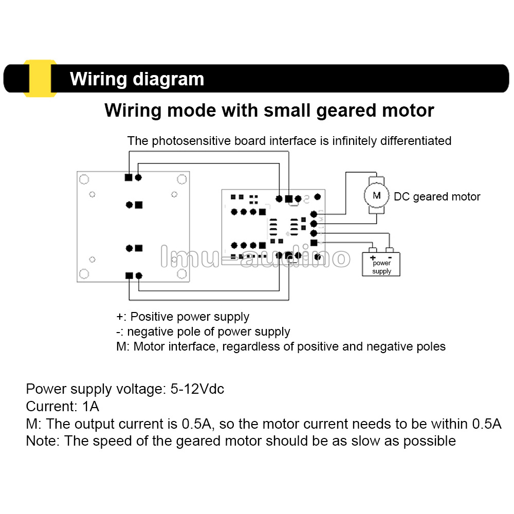 4. When the circuit directly drives the motor, only DC reduction motor can be selected, and the speed shall be as slow as possible, the current shall not exceed 0.5A, and the voltage shall be between 5-12vdc. Overload is not allowed.