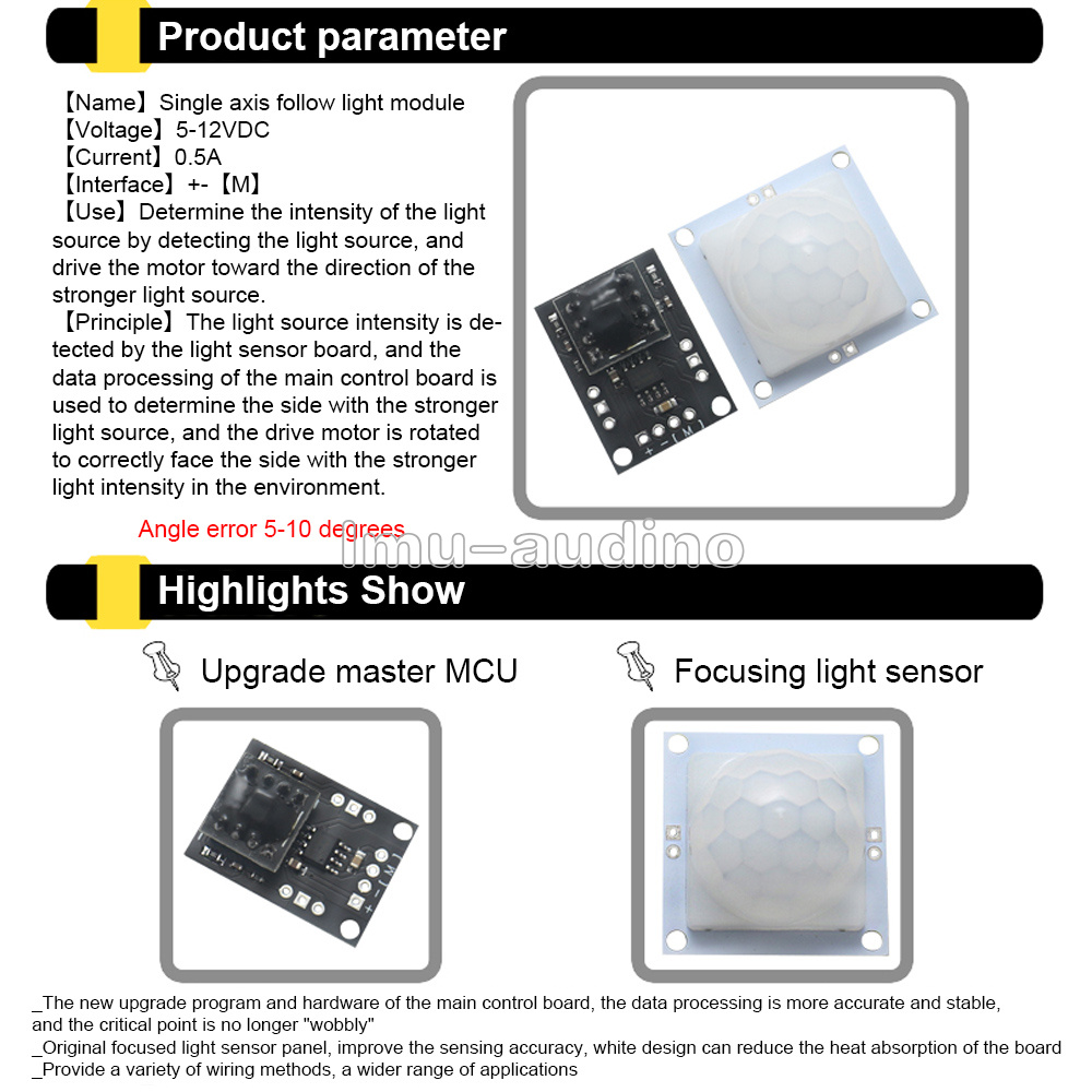[principle]: detect the light source intensity through the light sensing board, judge the side with strong light source through the data processing of the main control board, and correctly face the side with strong light intensity in the environment by driving the motor.