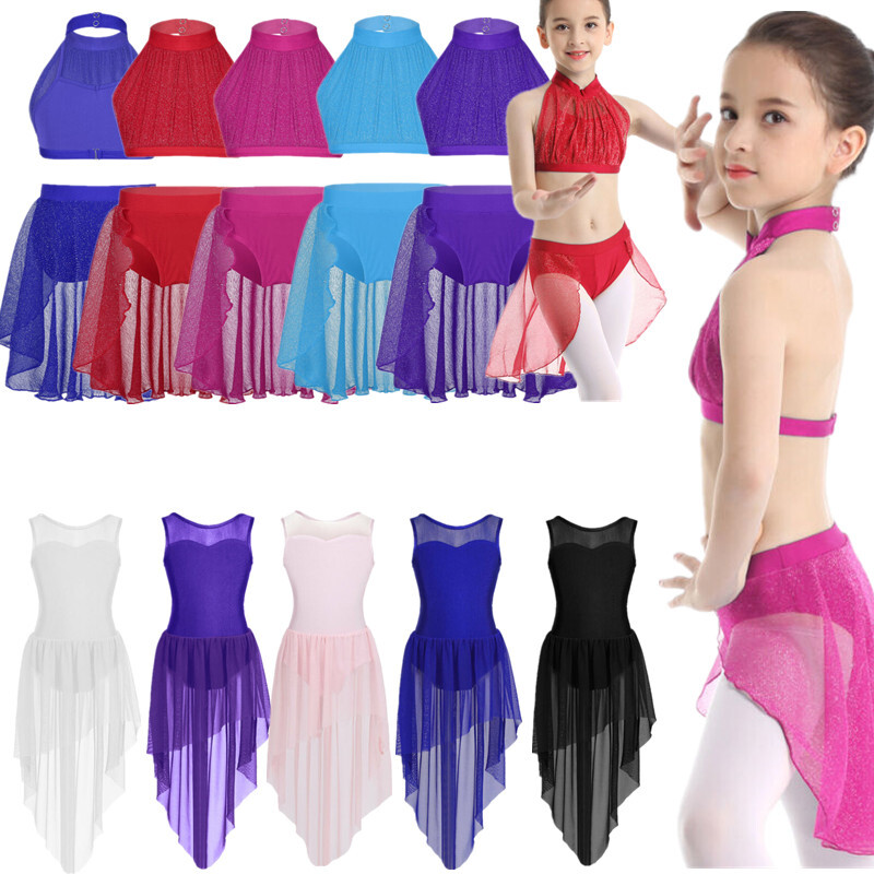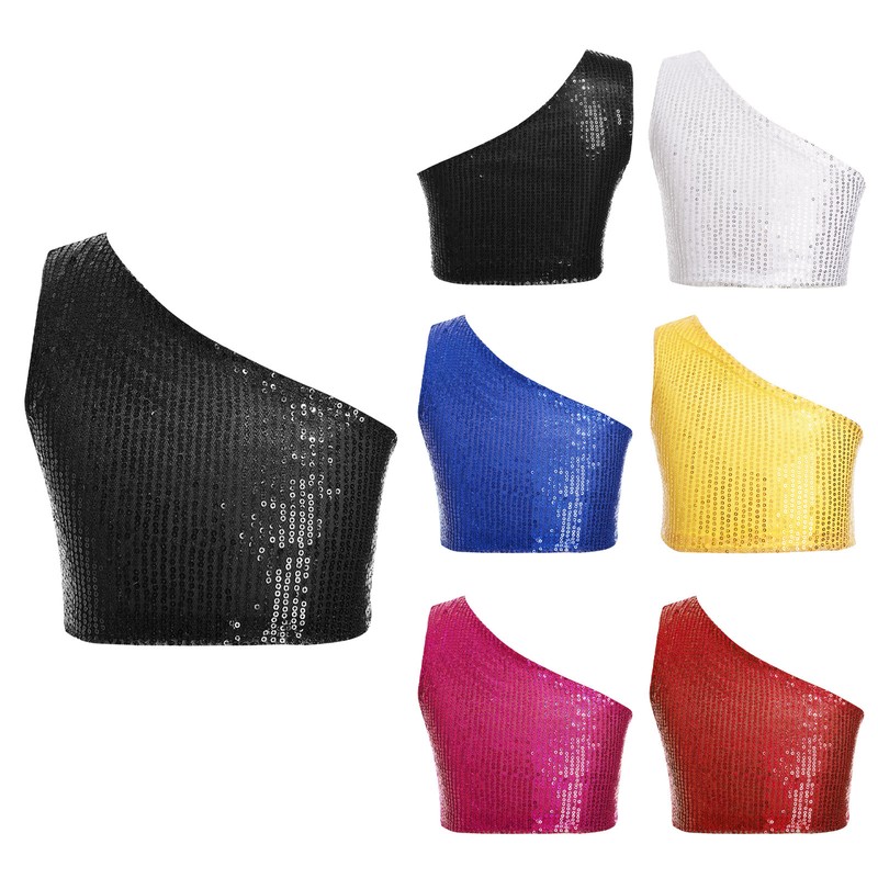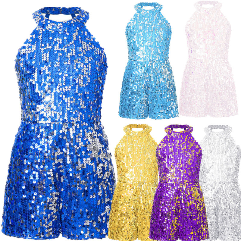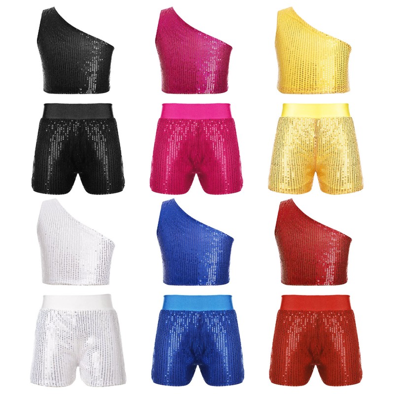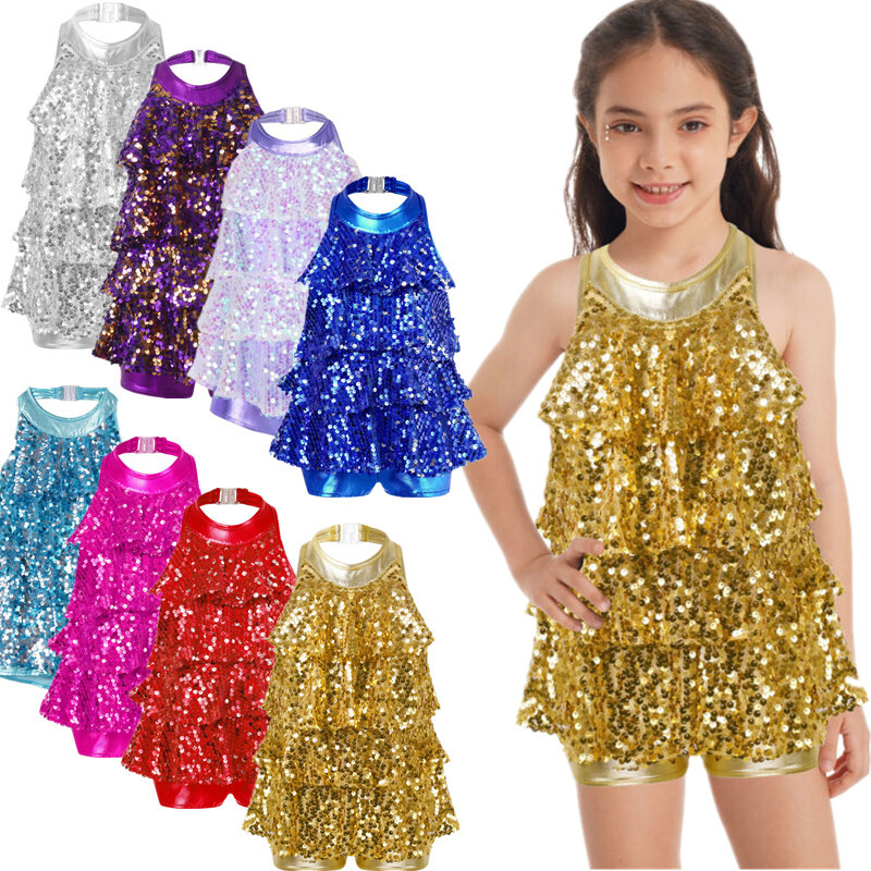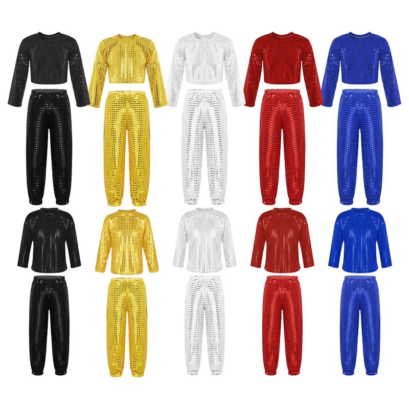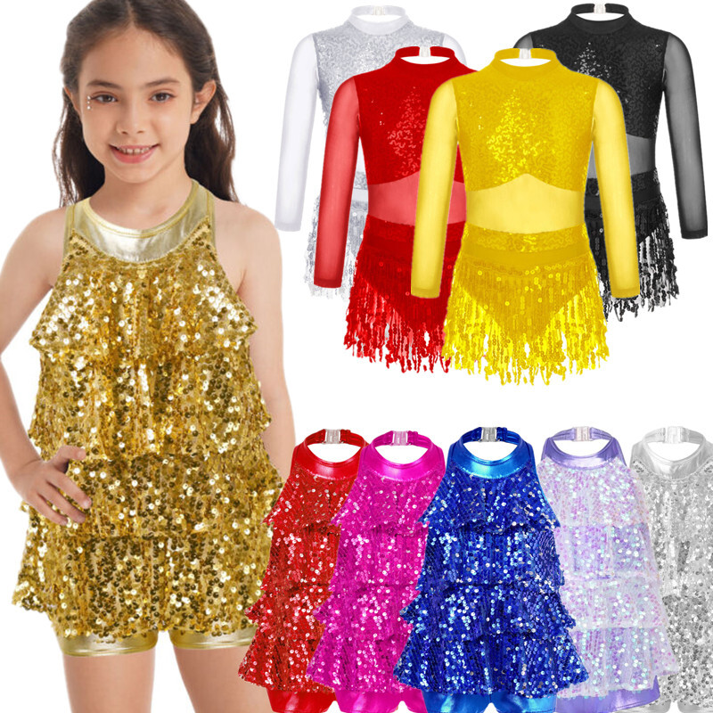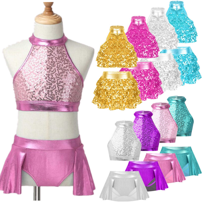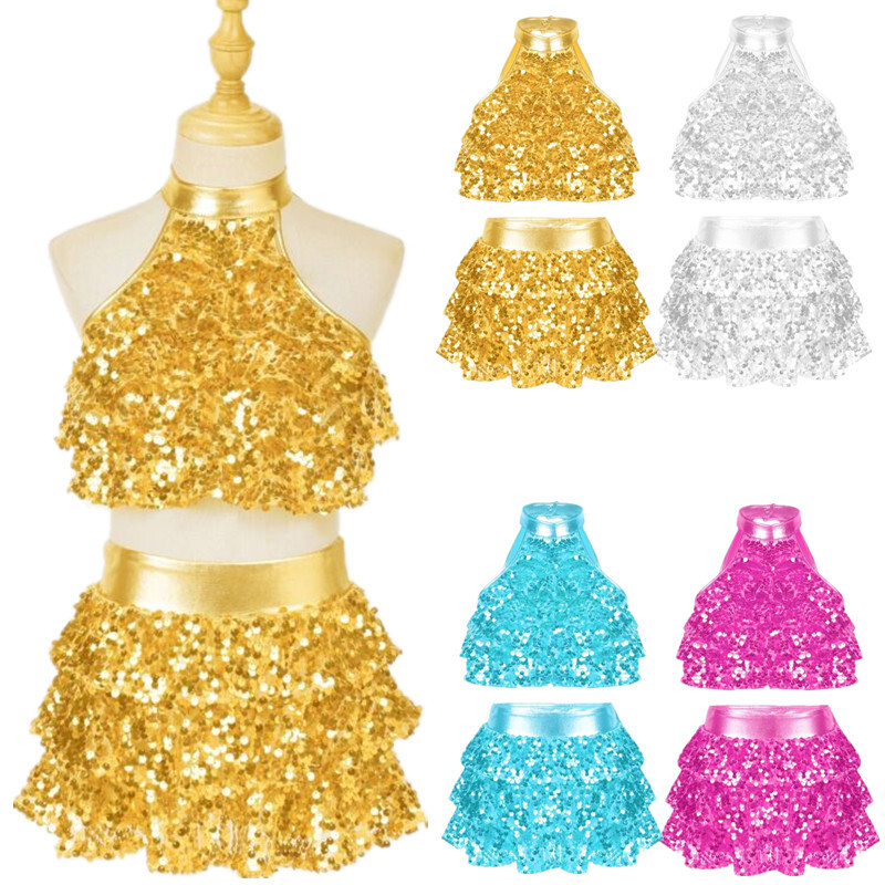 Kids Girls Modern Latin Jazz Dance Outfits Crop Tops Skirt Shiny Sequins Costume