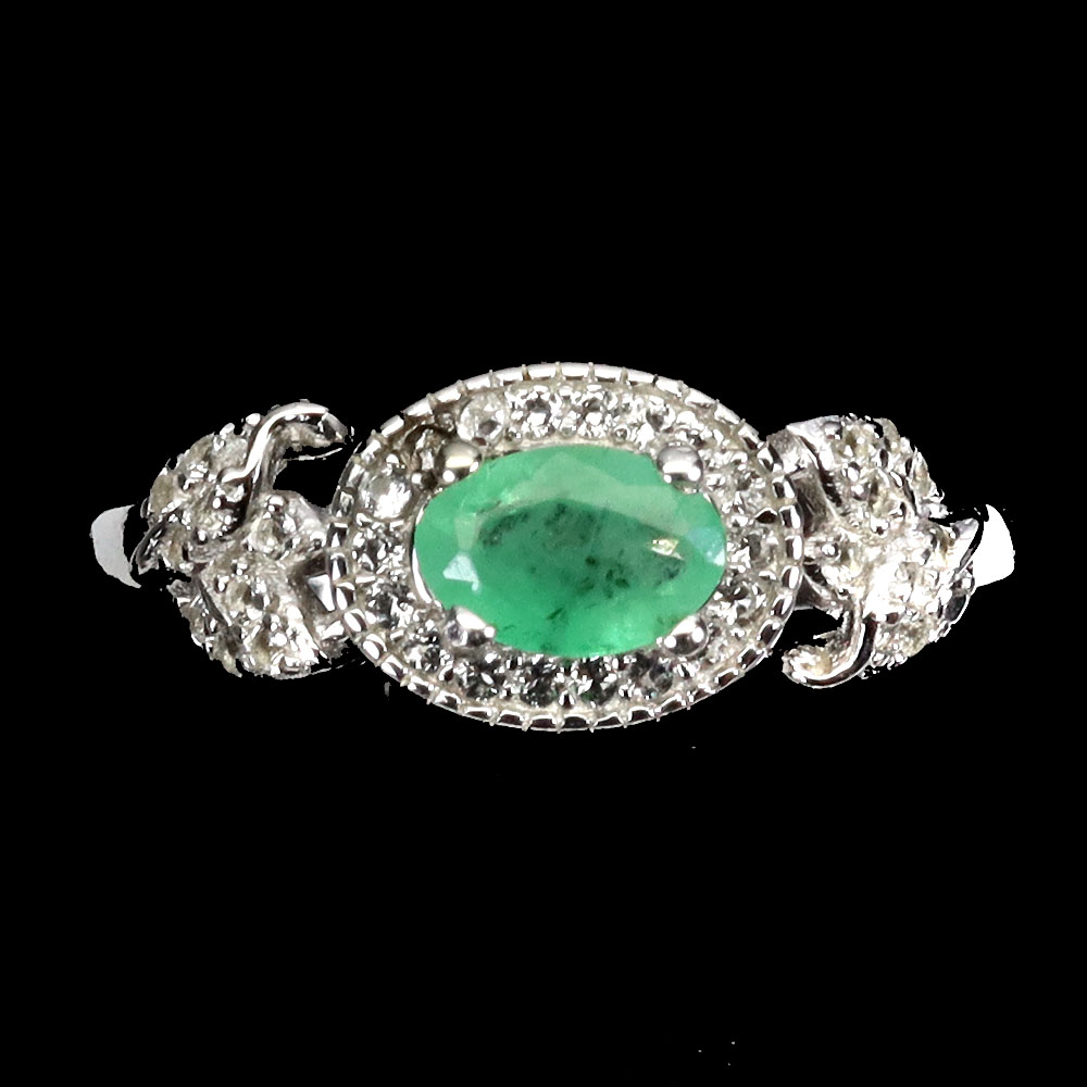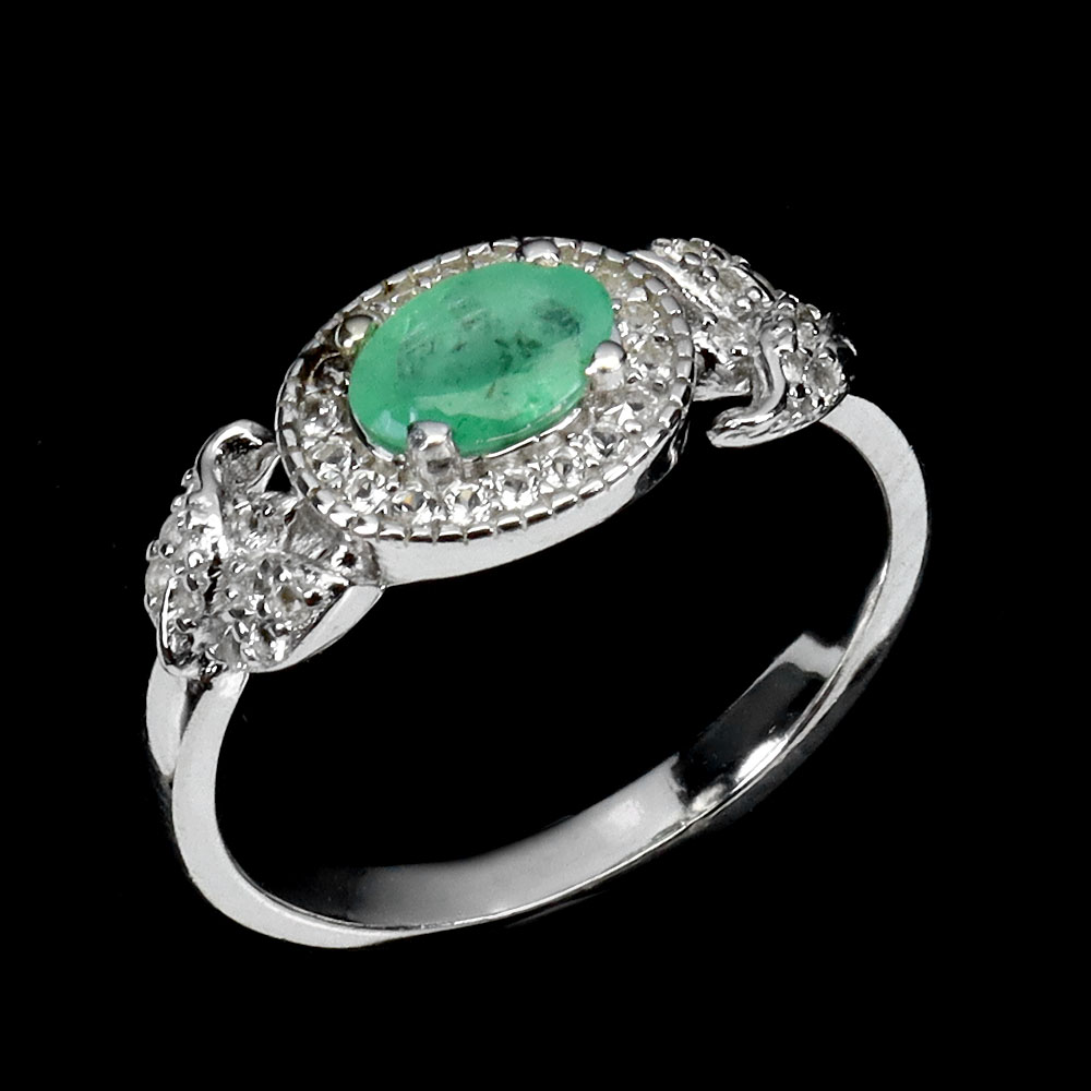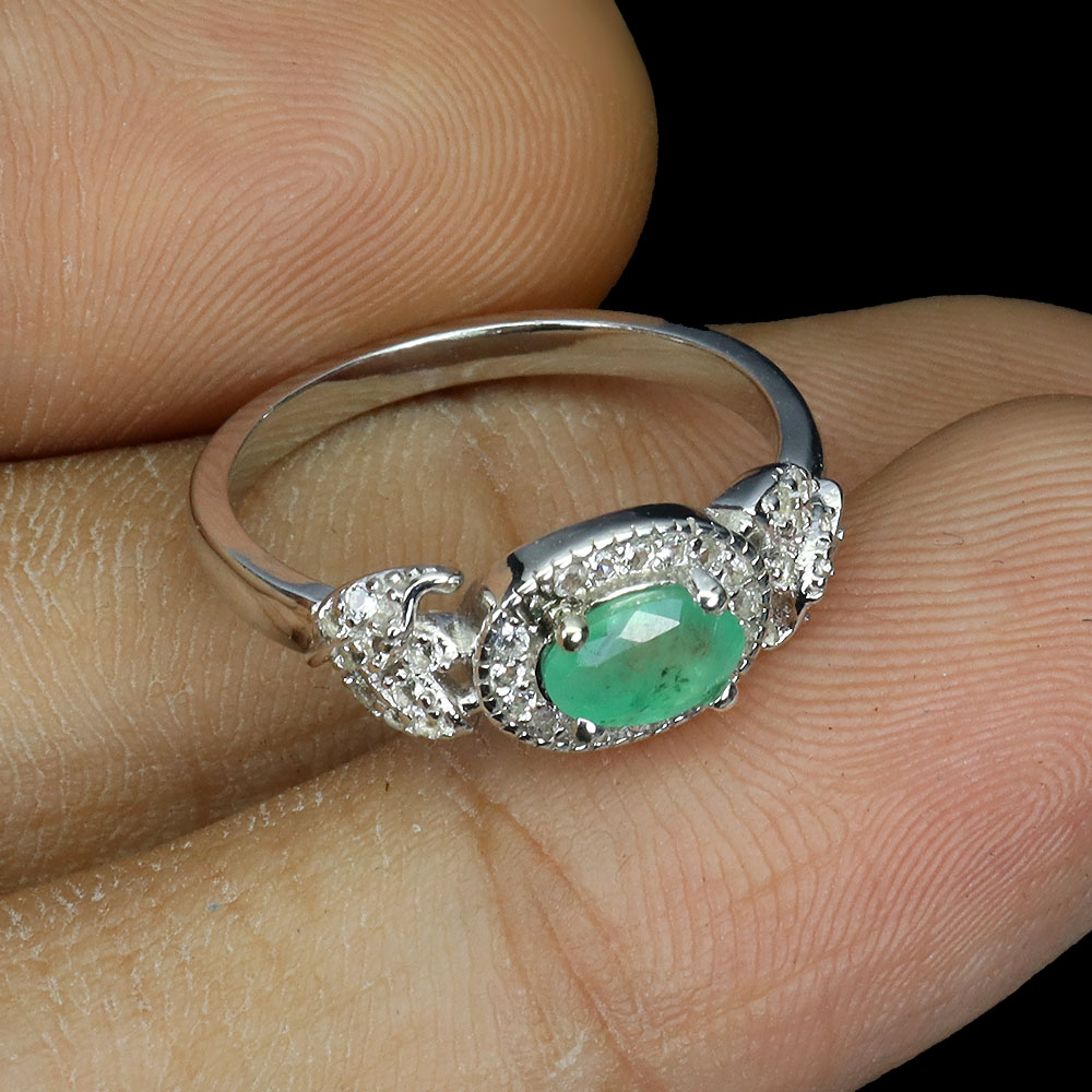 Unheated Oval Green Emerald 6x4mm White Topaz 925 Sterling Silver Ring Size 6