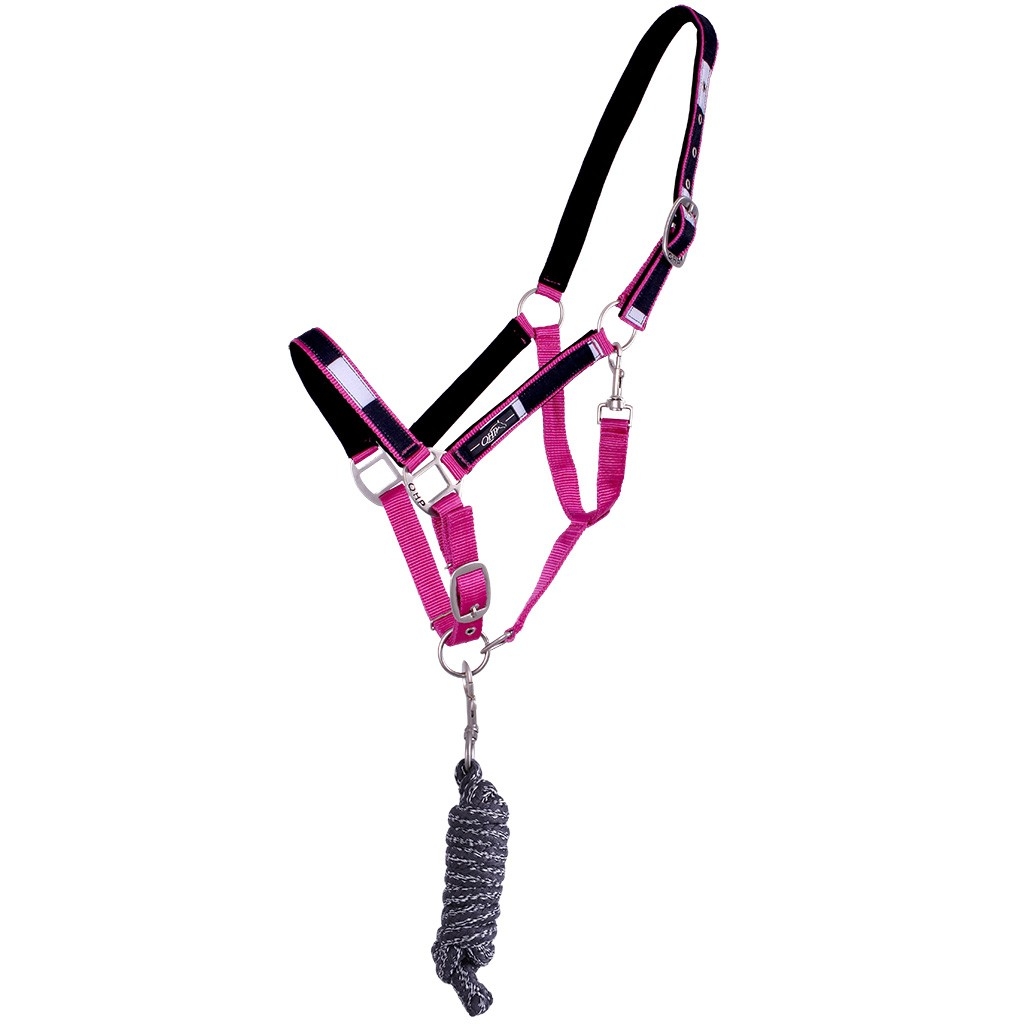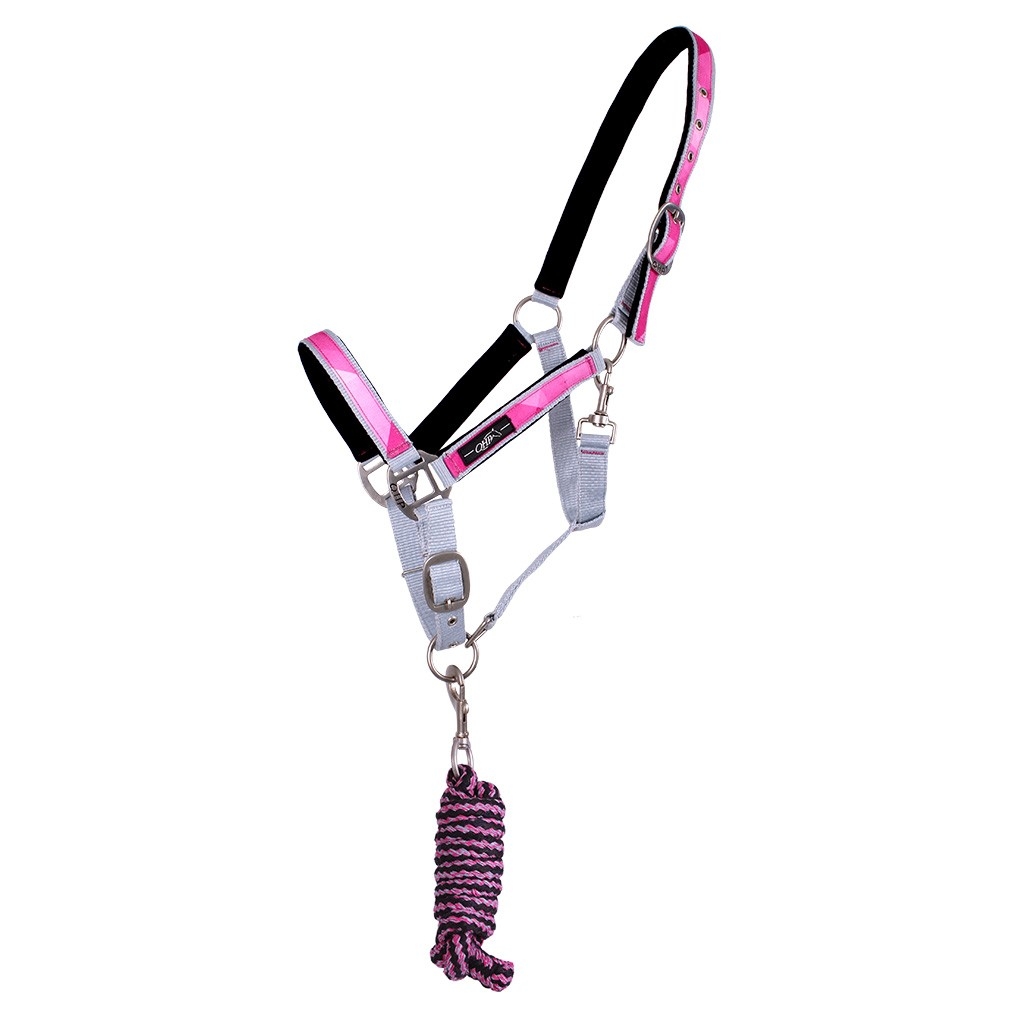 Gefüttertes Halfter Set mit auffälligem Muster und luxeriösen Verschnallungen. Wird mit einem farbig dazu passendem Anbindestrick geliefert.
