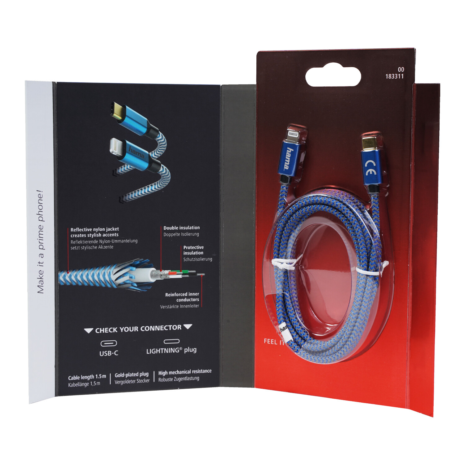 Spezielle Nylon-Ummantelung macht das Kabel besonders strapazierfähig, es lässt sich leicht aufwickeln und platzsparend verstauen