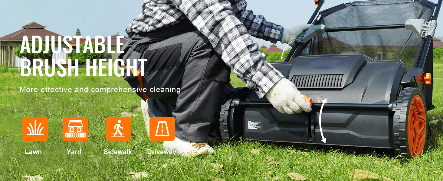 • Adjust to Any Terrain: The lawn sweep is designed with an adjustable spinning brush height–simply adjust the knob by hand to move brushes up and down without the need for any special tools. You can use it on any terrain, whether it's a sidewalk, driveway, yard, or garden.