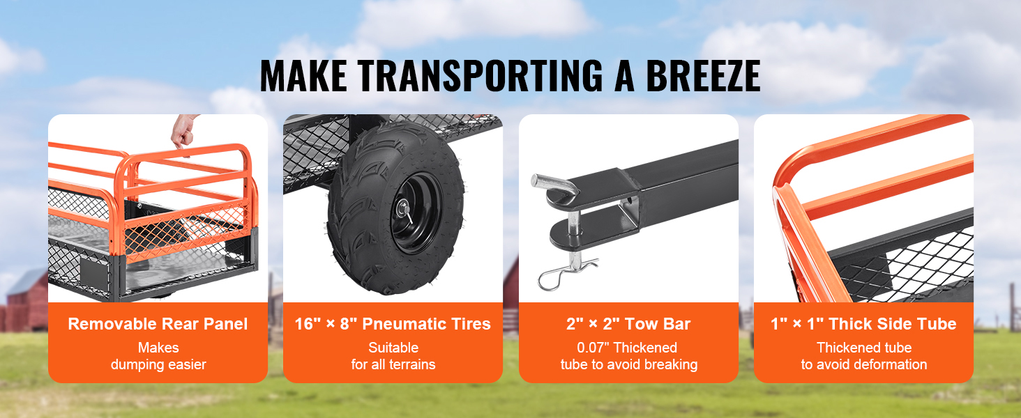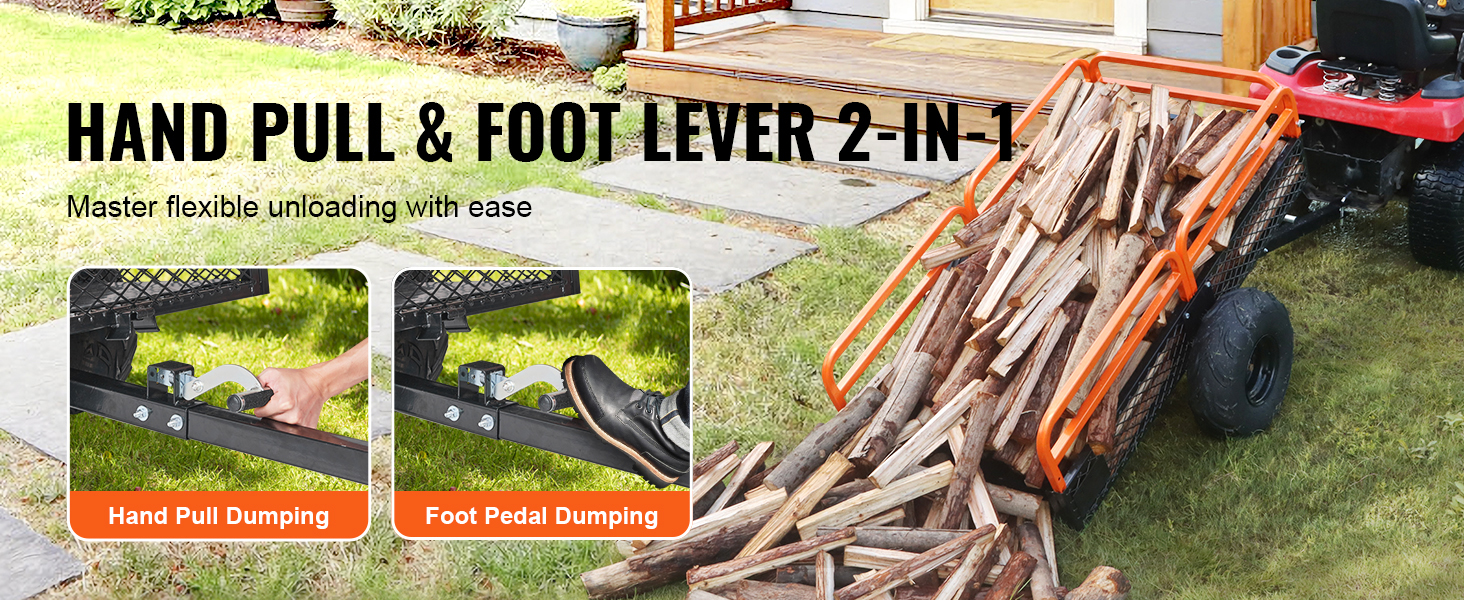Effortless Unloading: Simplify your yard tasks with this garden ATV trailer, designed with an easy-to-use dumping mechanism. With just a hand-pull or foot-step and the rear gate's quick release, you can efficiently dispose of debris, reducing manual effort and enhancing convenience.