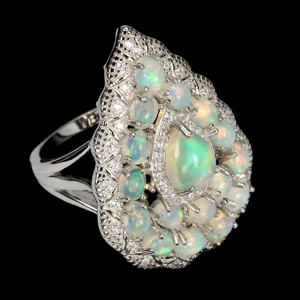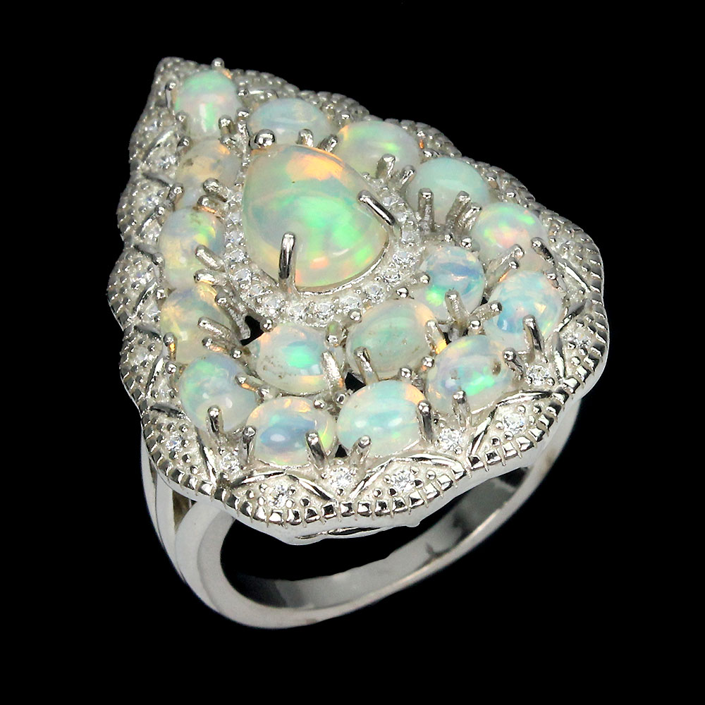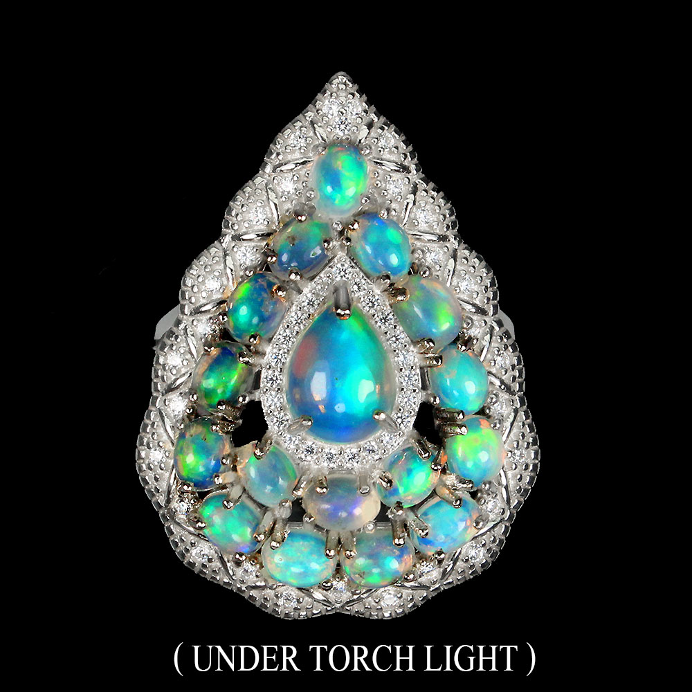 Unheated Pear Fire Opal Rainbow 8x6mm White Topaz 925 Sterling Silver Ring Sz 8