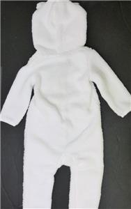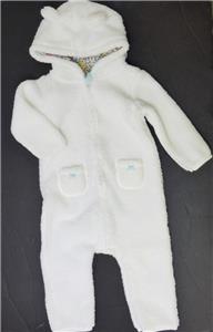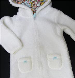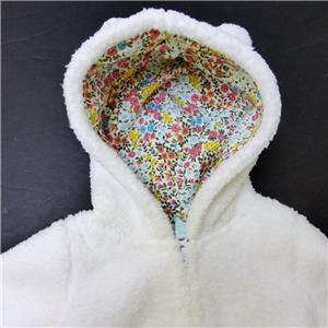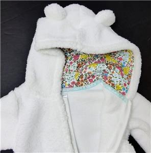 This hooded jumpsuit makes dressing quick and easy. Keep baby cute and cozy for the chilly weather! The white polyester outer fabric is soft and has a zipper down the front and pockets with tiny blue bows to slip tiny hands into to keep warm. The floral lined attached hood has 3D ears that make this outfit so adorable.