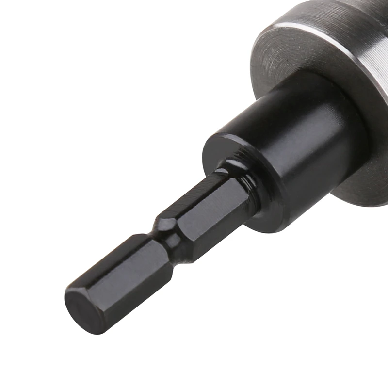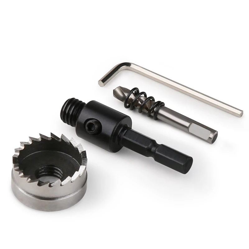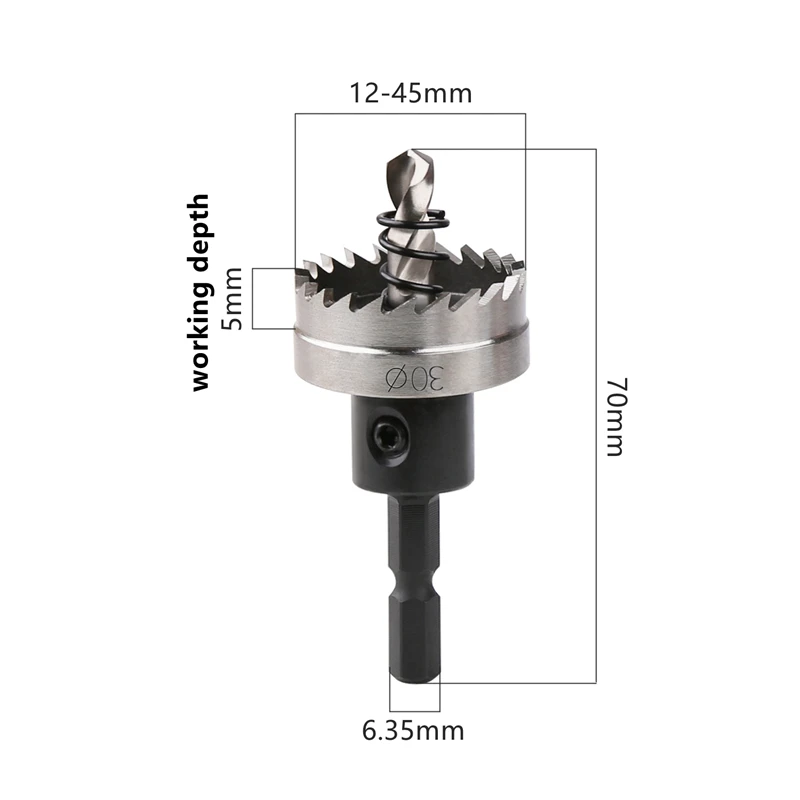 Specification: 12-60mm Meterial: HSS-4341 Length: 70mm Working depth: 5mm Shank: 12-45mm(6.35mm Hex Shank),48-60mm(3/8 Hex Shank) 1.Made of 4341 high-speed steel material, the crown step design can prevent the drill bit from being stuck, suitable for electric box drilling。 2.The handle adopts a 6.35mm hexagonal handle, which can be quickly installed and removed。 3.Suitable for thin metal materials, stainless steel less than 0.8mm, iron plate 2mm, aluminum alloy 2mm, plastic 4mm, etc. 4.Control the drilling speed when drilling, and add water or coolant to cool it properly, so as not to damage the drill bit due to excessive speed。 5.Not suitable for metal pipes, the crown step is easy to get stuck and cannot work