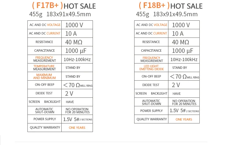 Capacitance | 0.01nF~100uF | ± (2.0%+5) | ||