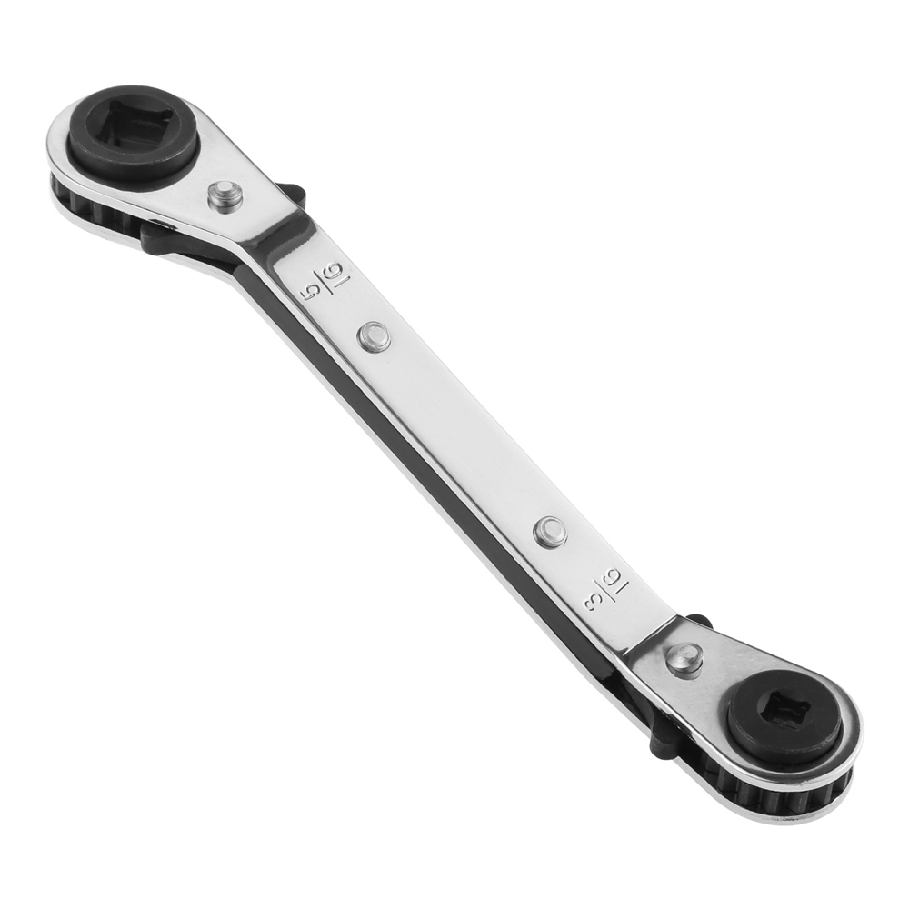 3, Ratcheting valve wrench for installing or servicing heating, air conditioning or refrigeration units and freezers, commercial and residential air conditioners.
