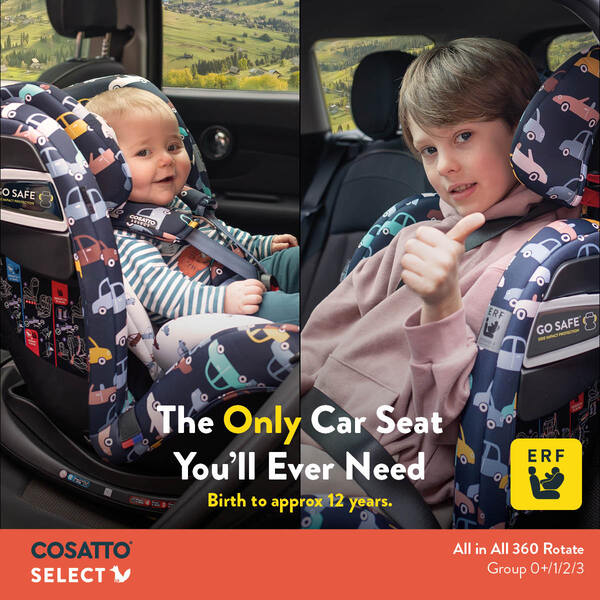 Wondering which car seat does it all? The All in All Rotate from Cosatto is here. With ISOFIX fitting options and suitable throughout all stages up to 36kg (approx. 12 years old), the All in All Rotate comes with all the great features of the All in All + including side impact protection as well as an excellent rotate feature for easy access.