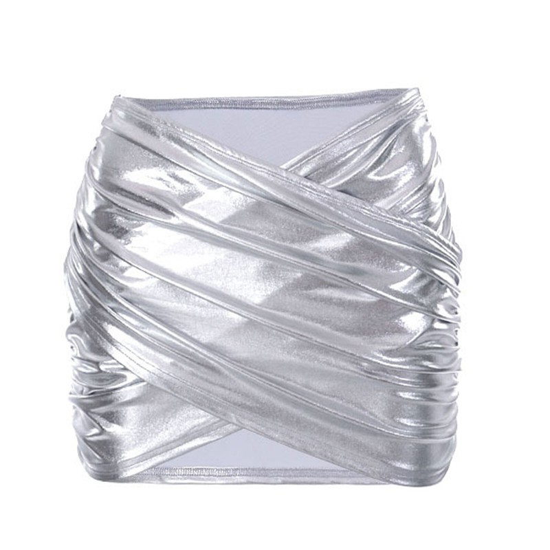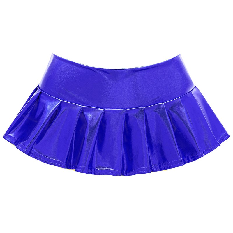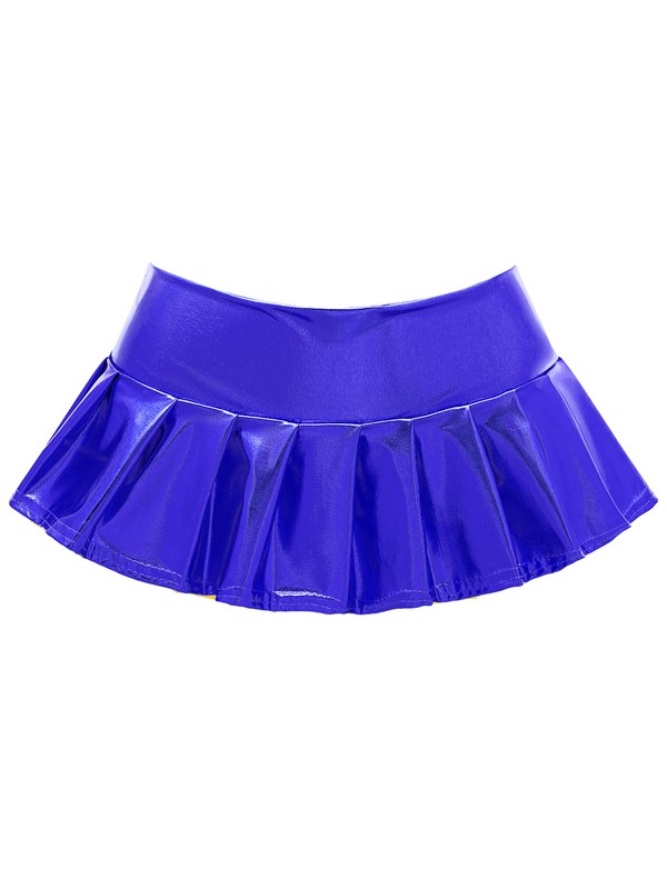 Low rise skirt, glossy surface, solid color, pleated design, mini length.