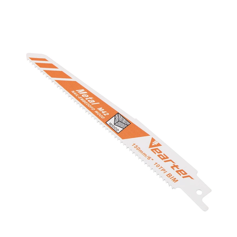 Brand: Vearter Metrial: M42 Bi-Metal with 8% Cobalt Length: 150mm (6inch) TPI: 10TPI Use: Medium-thick sheet metals (3 to 8mm), metal pipes/profiles (dia.<100mm) 1. The teeth are made of M42 BI metal with 8% cobalt, our reciprocating saw blades last 2 times longer than normal bi-metal saw blades without cobalt. 2. The hard cobalt edge can easily cut metal wood,nail-embeddfd wood,cast iron wood beam and thick metal 3. The blade for fast, efficient, aggressive cuts in nail-embedded wood, engineered lumber, chipboard and glass fiber-reinforced plastics < 100mm.100mm. 4. 0.9 Thin wall and fixed tooth design help reduce heat build-up and maximize cutting efficiency. 5. Fits all Sawzall tools on the market, including Bosch, Dewalt, Milwaukee Sawzall Saw, SKIL, Makita, Black & Decker, Ryobi, Porter Cable, Hitachi, Flex, Hilti, Metabo, etc.