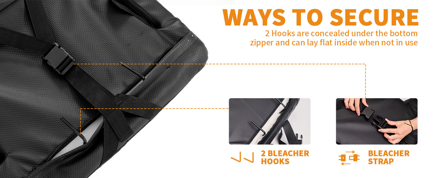 Easy to Carry: The stadium seats for bleachers comes with backpack straps, collapsible and portable, allowing you to take it anywhere. Our bleacher seats comes in 2 sizes, armrests up measures 16", if you think bleacher chairs is too narrow you can put the armrests down and the size is 21". You can also use hooks to fix bleacher seats with backs and cushion so that the seat is not easy to slide. (NOTE: The snap hooks are hidden inside the bottom zipper.)