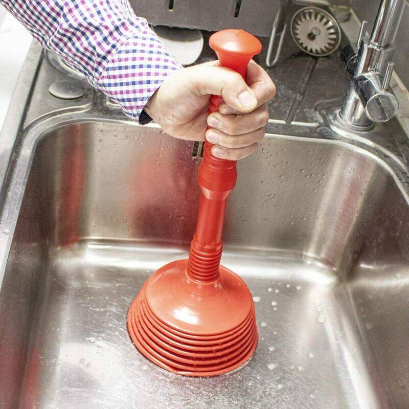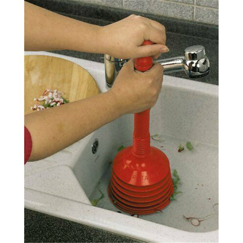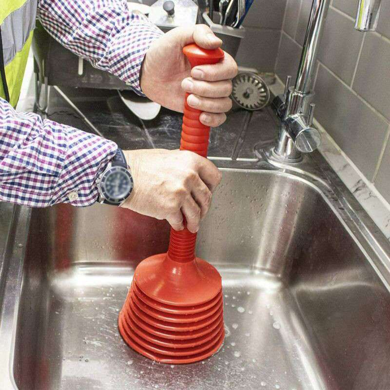 IT CLEARS SLOW AND BLOCKED DRAINS: Slow draining showers and baths are a common problem, the plunger fixes it - everytime. Apply over the drain even when your shower tray is full and within a few pumps the cause of the blockage will be removed.IT CLEARS SINK BLOCKAGES FAST - Place the large opening over your clogged plug pump it a two times. You'll clear more in 10 seconds than any other type of plunger. Guaranteed.HEAVY DUTY: The power comes from you pressing down on the bellows when it's over the plug, forcing the trapped air down the plughole. This is the same method as a traditional plunger, but with a much greater (8x) volume of air being forced down.EASY TO CLEAN: Made with 100% recycled PVC. When you're done just spray it with bleach and run it under the tap/shower. The head is removable for easy storage.