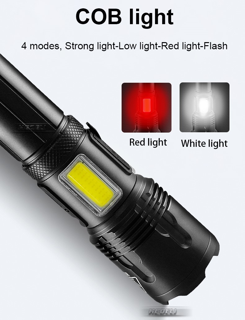 Switching modes: 3 XHP120 LED modes (high - low - SOS) + 4 COB modes (white 100% - white 50% - red 100% - red SOS)