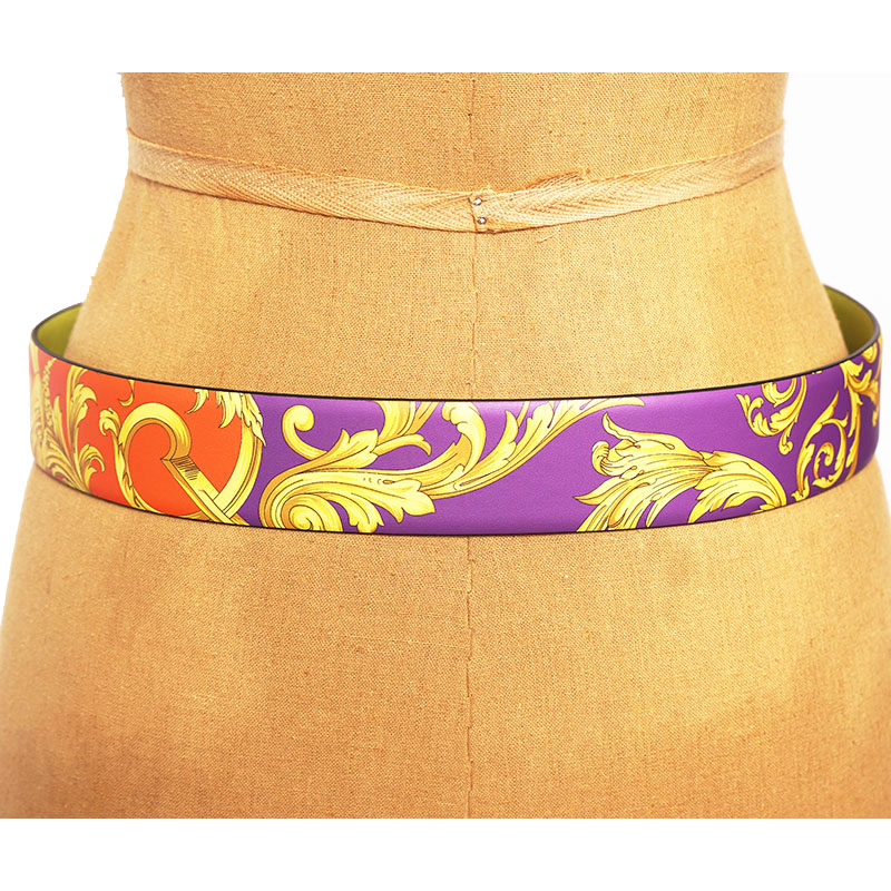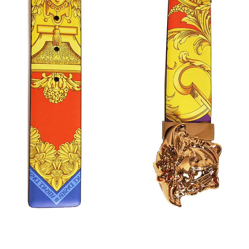 Authentic Versace belt in a stunning classic print. Reversible belt: buffed leather in citron (a lime yellow-green) on one side and Heritage print in a vibrant baroque motif leather on the other side. Many hues of orange, yellow and blue. Polished gold-tone three-dimensional La Medusa buckle. Adjustable post-stud fastening. Includes two belt loops. Style DCU6705. Made in Italy. Sure to get noticed. Great colors for spring, summer and into the fall.