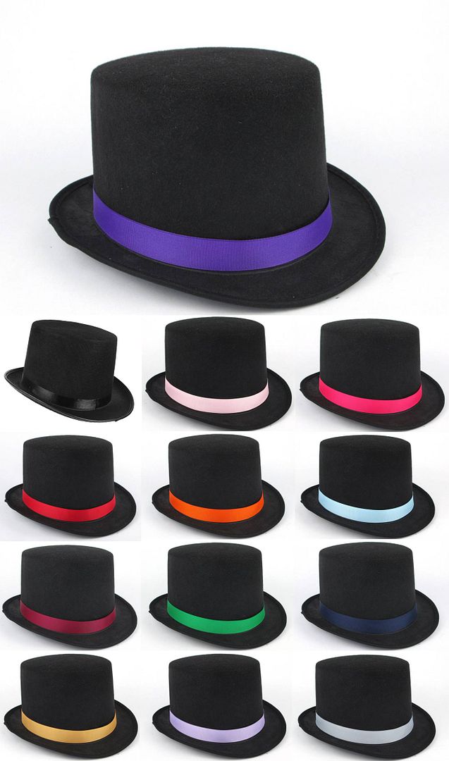 Adult Felt Top Hat w/ Ribbon Material: Felt Shape: Top Hat Size: One size fits most adult (5" tall, 23 - 24" around) Available in different ribbon colors: Black Red Gold Silver Grey Orange Green Navy Blue Light Blue Light Pink Hot Pink Lavender Purple Wine A great hat for any theatrical plays or musicals! Art. HAT002