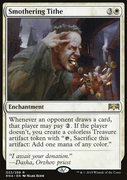 | | Name: | Smothering Tithe | | Set: | Ravnica Allegiance | | Number: | 22 | | Condition: | Light Play | | Language: | English | | Variation: | Non-Foil | |