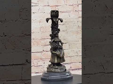 Adding to the allure of this masterpiece is the inclusion of a candle holder, combining art and function. This dual-purpose sculpture not only captures the essence of the maiden's beauty but also provides an elegant way to illuminate your space. The dark bronze patina enriches the sculpture's details, adding depth and dimension to every curve and contour.