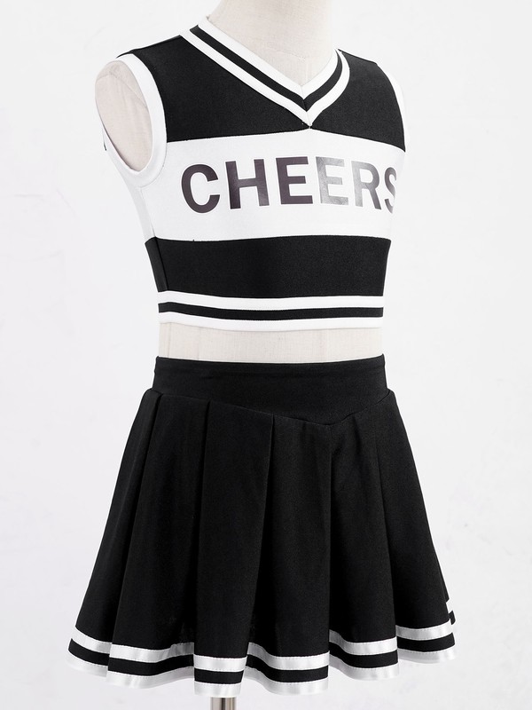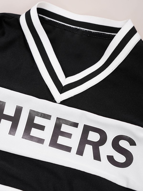 Sleeveless, V neckline crop top, letters CHEERS printed at front. Contrast color style.