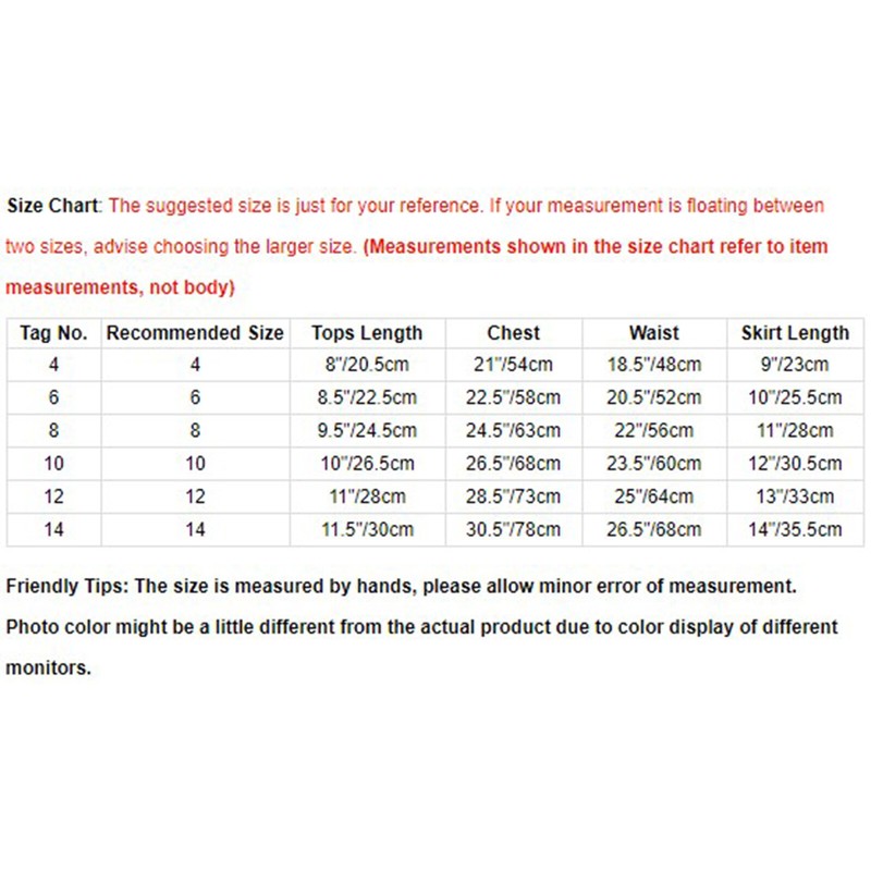 | Tag No. | Recommended Size | Tops Length | Chest | Waist | Skirt Length |