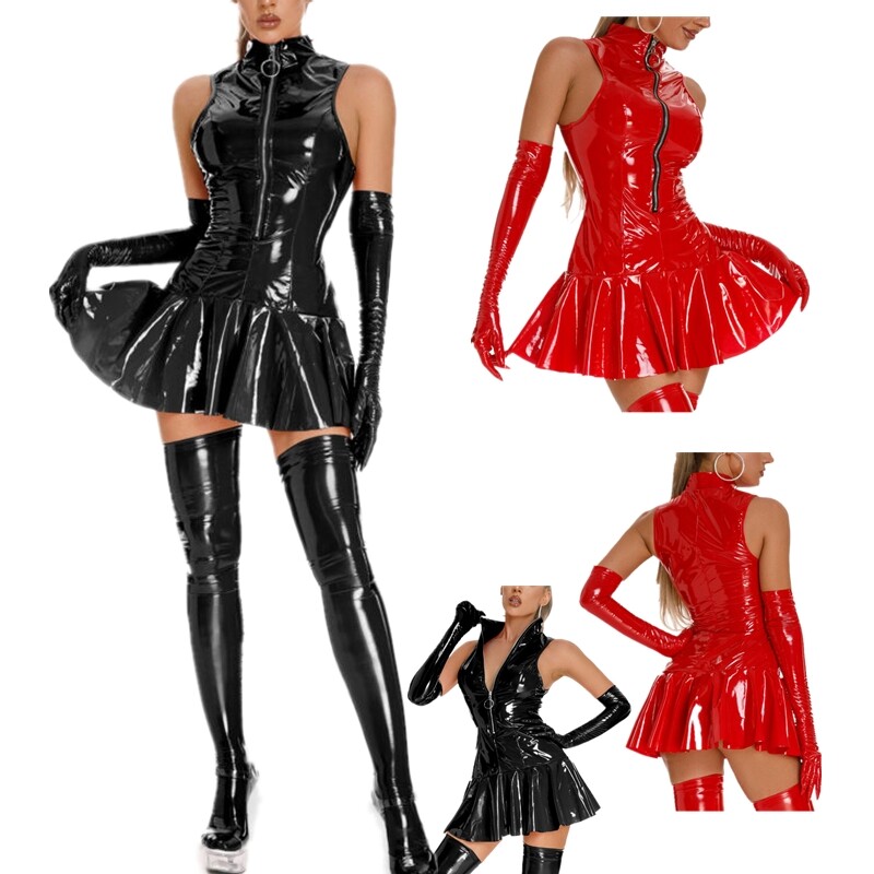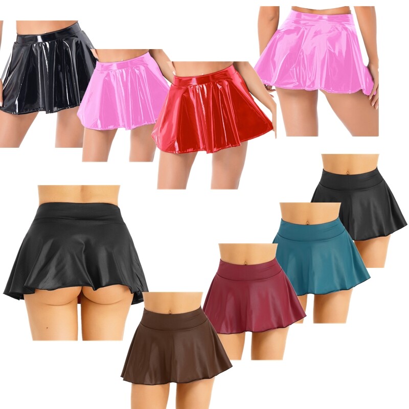 Women Wet Look Patent Leather Fringed Miniskirt Low Waist Tassel Skirt for Stage Performance.