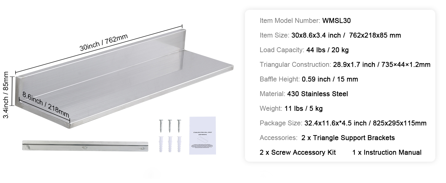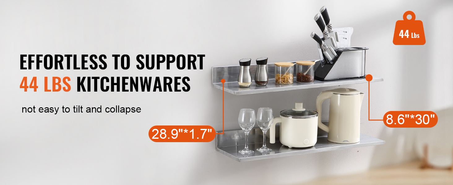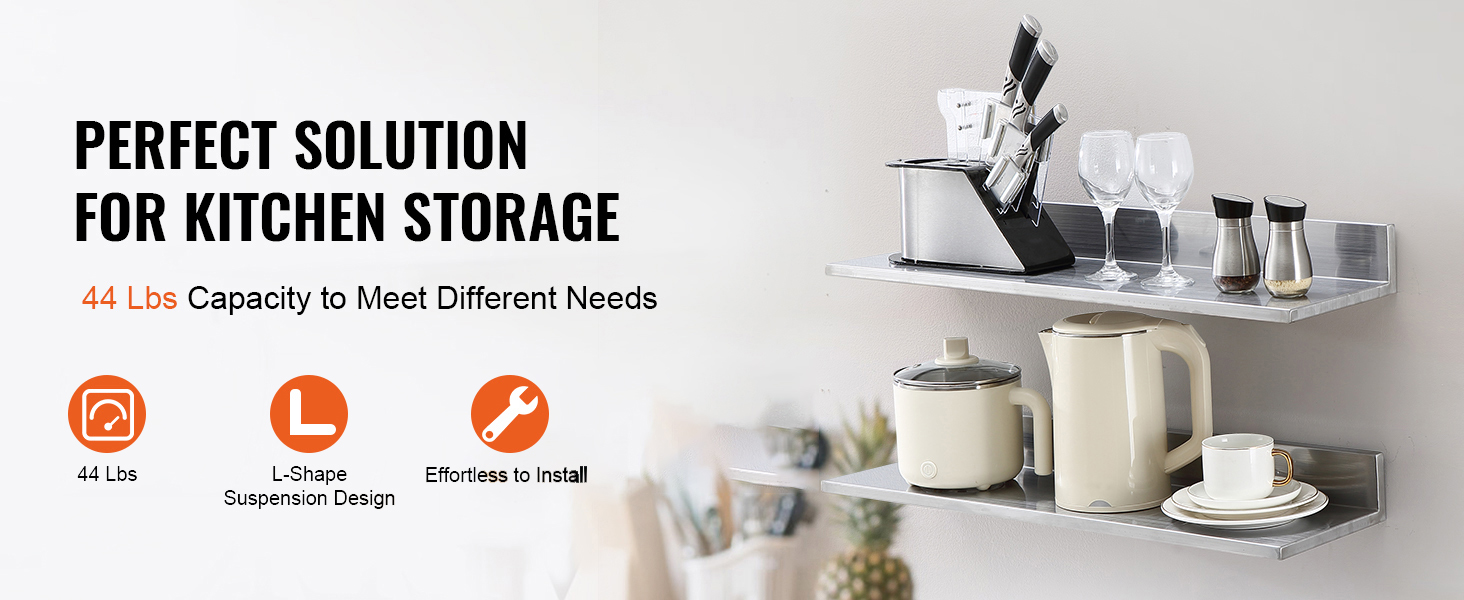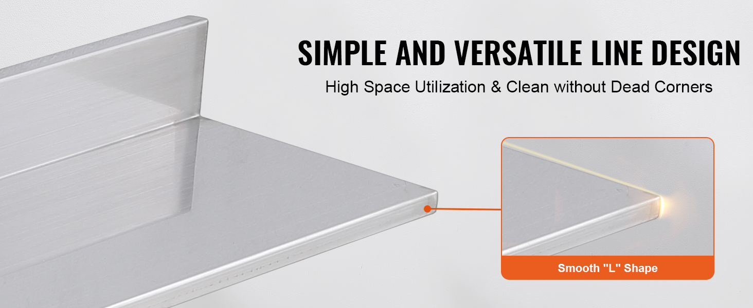 Robuste & solide Konstruktion: Unser Wandregal besteht aus NSF-zertifiziertem 430er-Edelstahl, der eine lange Lebensdauer und einfache Reinigung gewährleistet. Die Oberfläche ist gebürstet, um alltäglichen Kratzern, Korrosion und Anlaufen zu widerstehen. Sie brauchen sich also keine Sorgen zu machen, dass Speise- oder Flüssigkeitsspritzer die Oberfläche beschädigen.