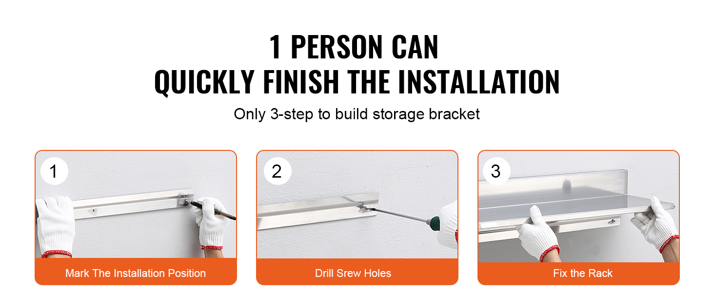 Einfache Montage: Unser kommerzielles Wandregal wird mit komplettem Zubehör für eine arbeitssparende Montage geliefert. In nur 3 Schritten haben Sie ein geräumiges Regal ohne Probleme.