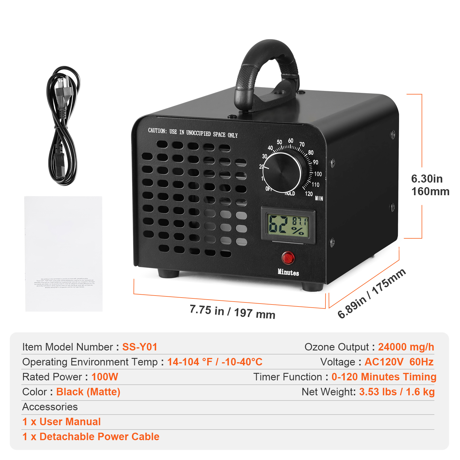 With 24,000mg/h powerful max ozone output and 3,230 square feet coverage area, VEVOR ozone generator prioritizes your health by effectively eliminating odors, smoke, and pollutants from air. It features humidity display and 0-120 minute timer, ensuring indoor environment is constantly monitored.