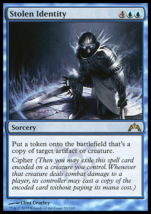 | | Name: | Stolen Identity | | Set: | Gatecrash | | Number: | 53 | | Condition: | Lightly Played (Excellent) | | Language: | English | | Variation: | Non-Foil | |