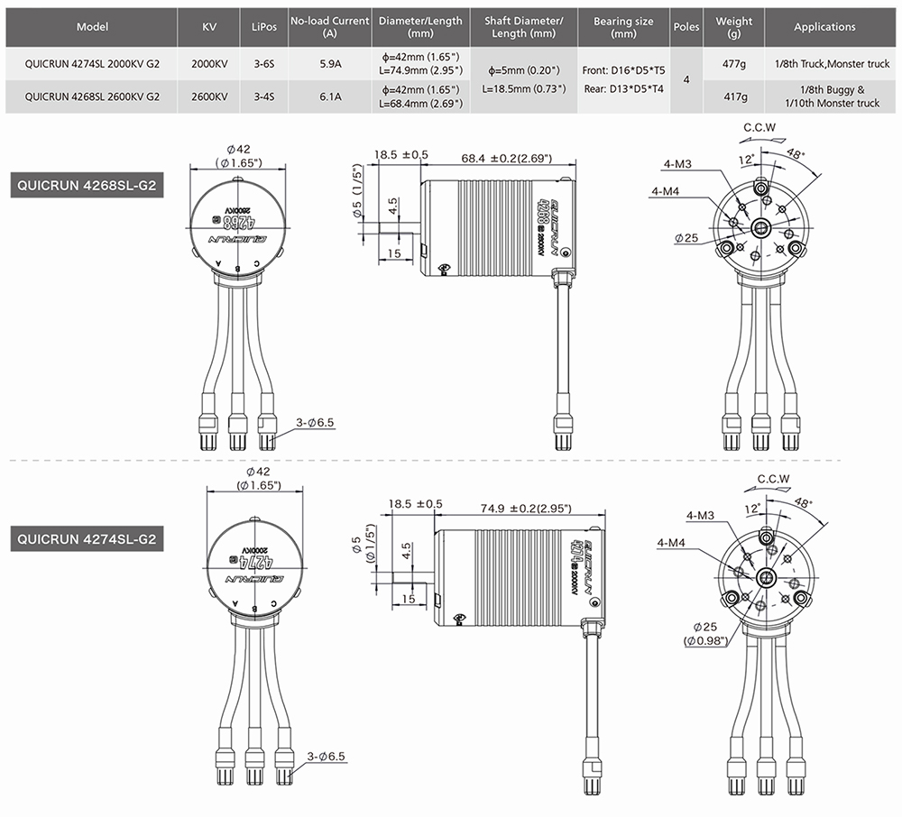 Application Motor: 4274SL 2000KV 3-6S/ 4268SL 2600KV 3-4S motors;