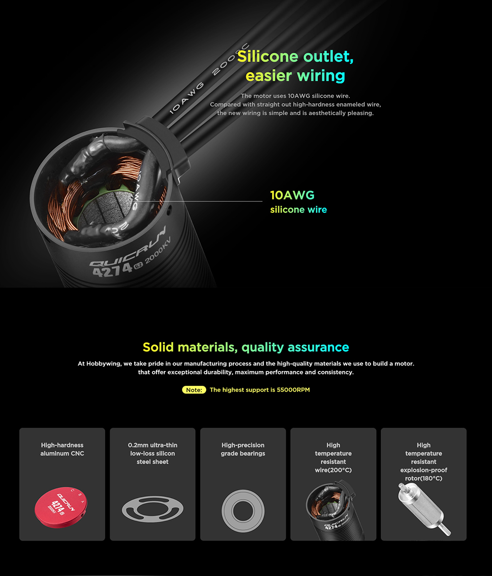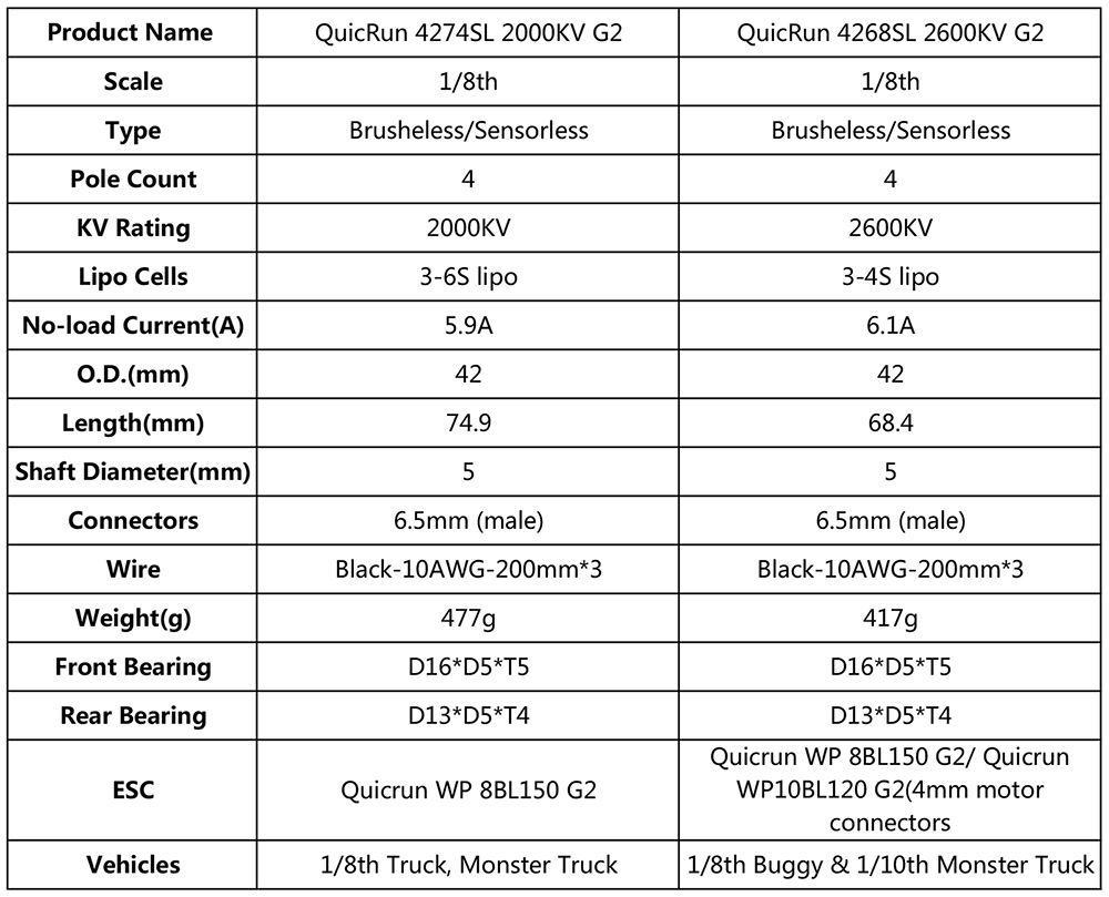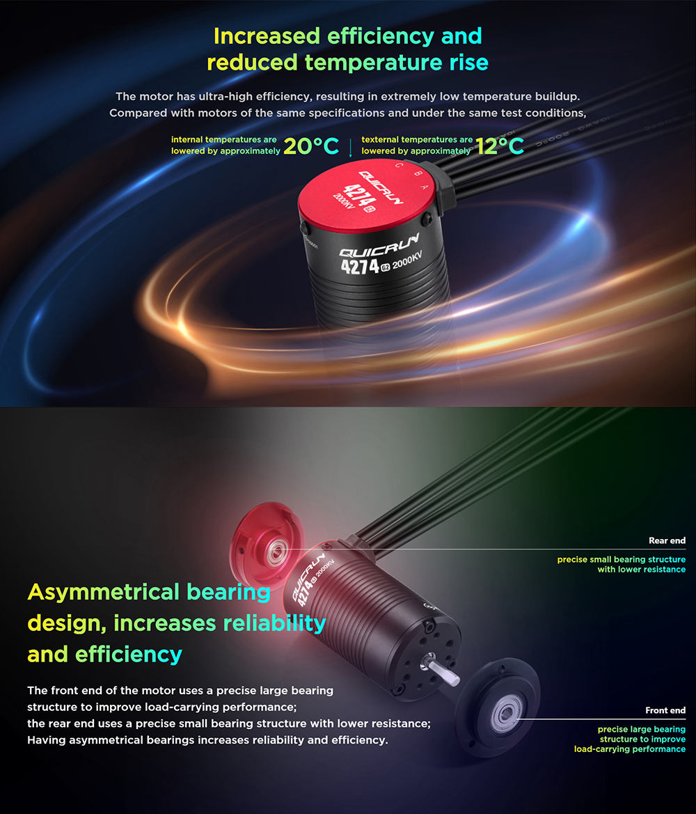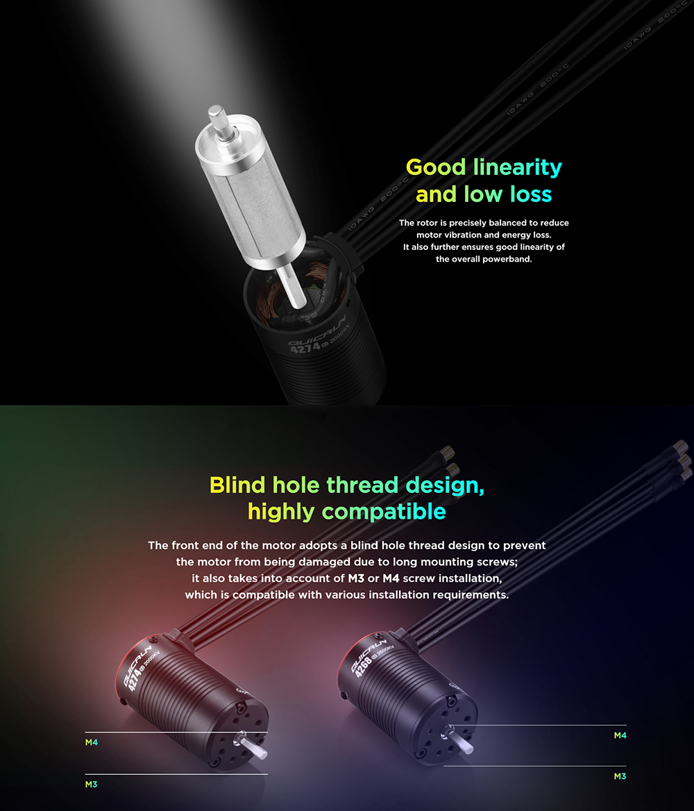 The 4274SL 2000KV 3-6S/ 4268SL 2600KV 3-4S motors and 150A ESC are waterproof and dustproof and have good heat dissipation. Precision designed for maximum energy conversion. Easy and convenient for installation.