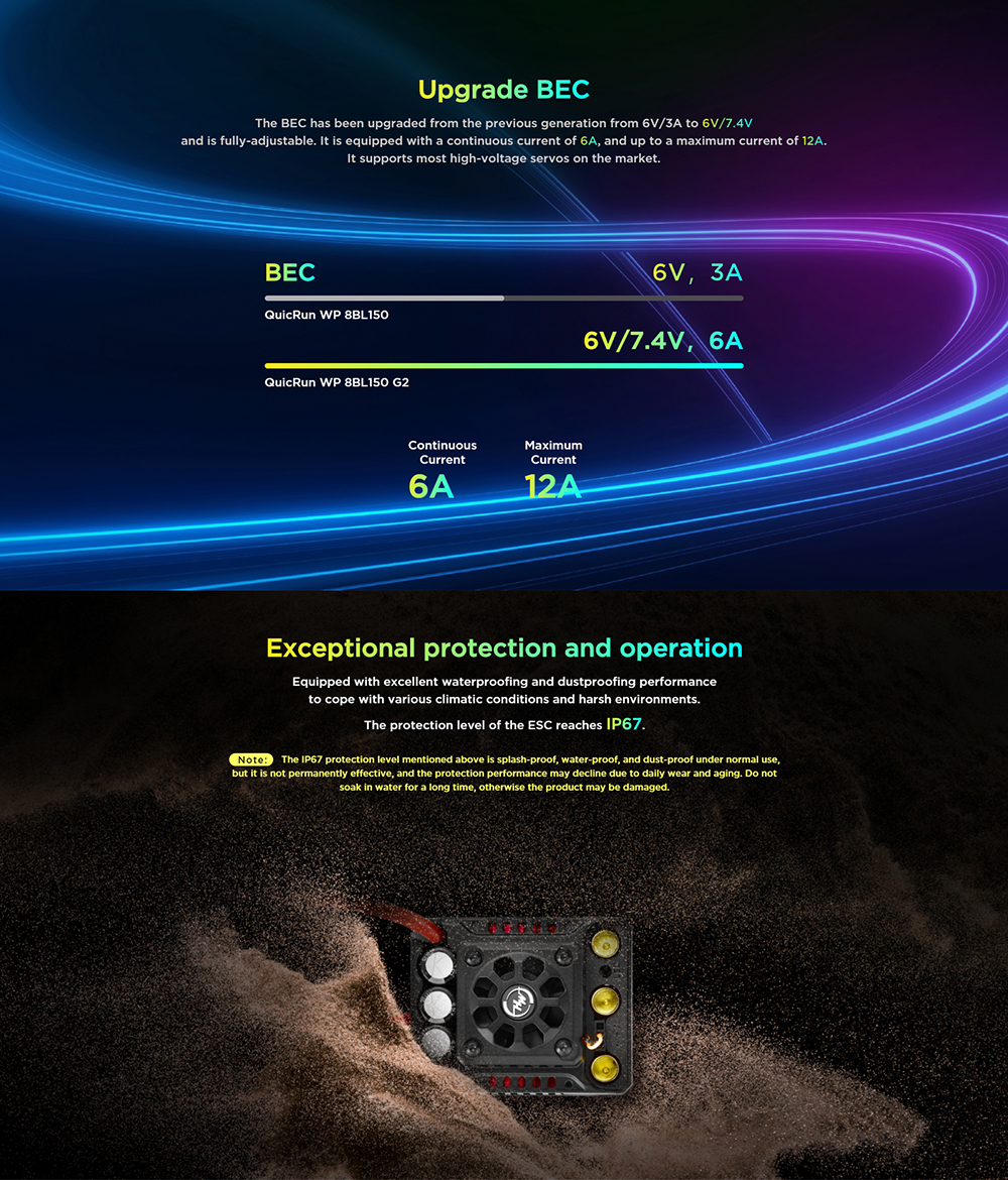 1. Water-proof ESC, compatible with sensorless brushless motor, perfectly fit for 1/8 RC car.