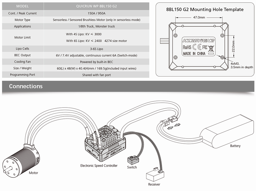 BEC Output: Switch mode 6V/7.4V @ 6A;