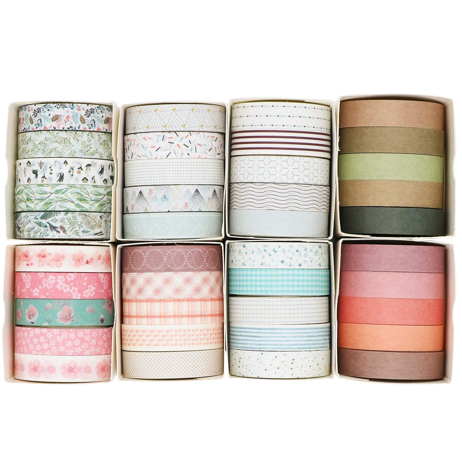 - VARIETY OF DESIGNS - 40 piece washi tape set in various patterns and colors that are perfect for note-taking, tone-setting in any notebooks, journals or DIY projects. This crafting tape assortment features geometric prints, botanical plants leaves, sakura cherry blossom, solid colors and more designs (No Duplicates!) This is a great value for what you get!