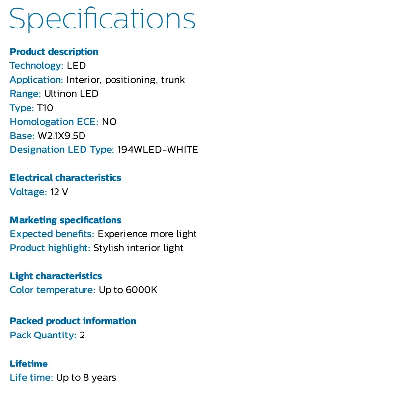 Whether you're applying the Philips Ultinon LED to the signal of your car, the trunk or glove compartment, the cool light will ensure a stylish, broad projection that is also sensitive to your eyes. The application of the Ultinon LED bulbs to your external signaling units will strengthen their projection of light, making you more visible to others – and safer as a result. As well as offering enhanced style and vision inside your car, the Ultinon LED will enhance your visibility, making your vehicle stand out to other drivers.