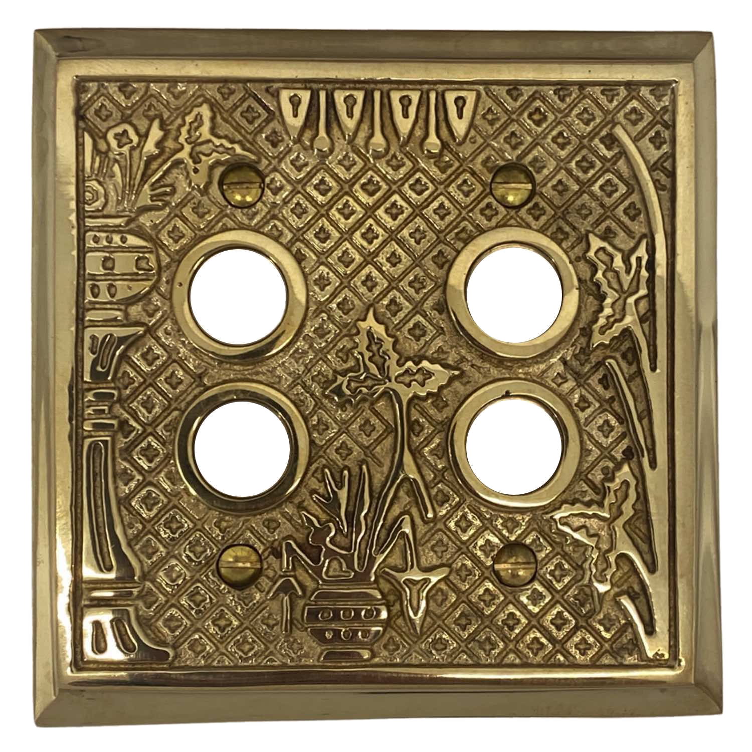 This Victorian style piece of ornate switch plate hardware features a detailed flower pot design over a checkered background and a heavy duty solid brass casting - not the thin stuff.